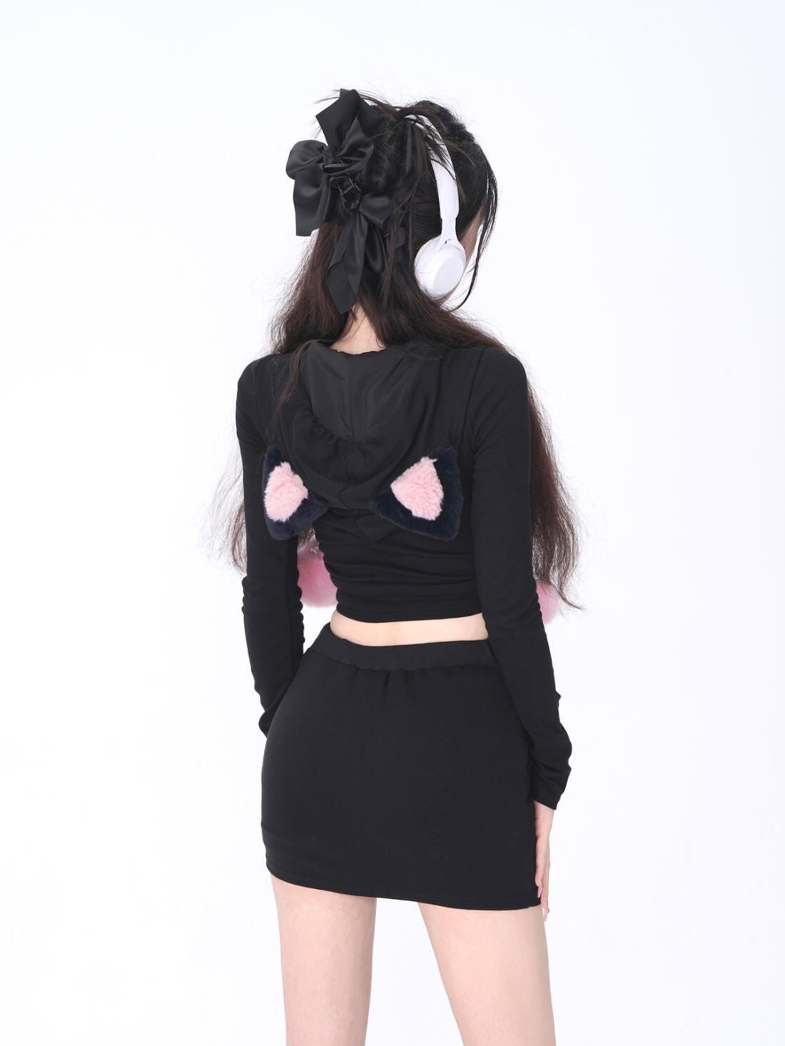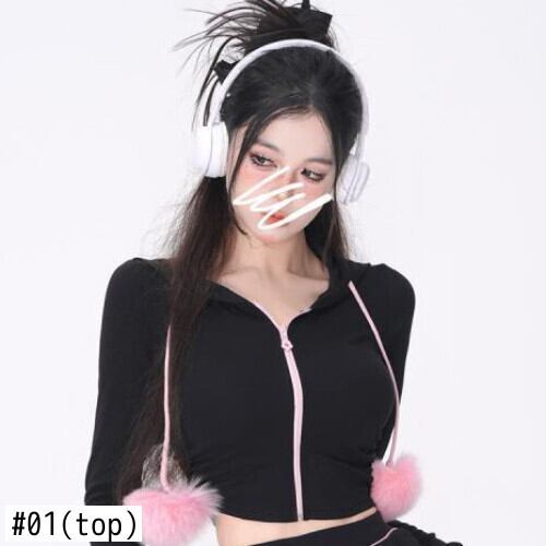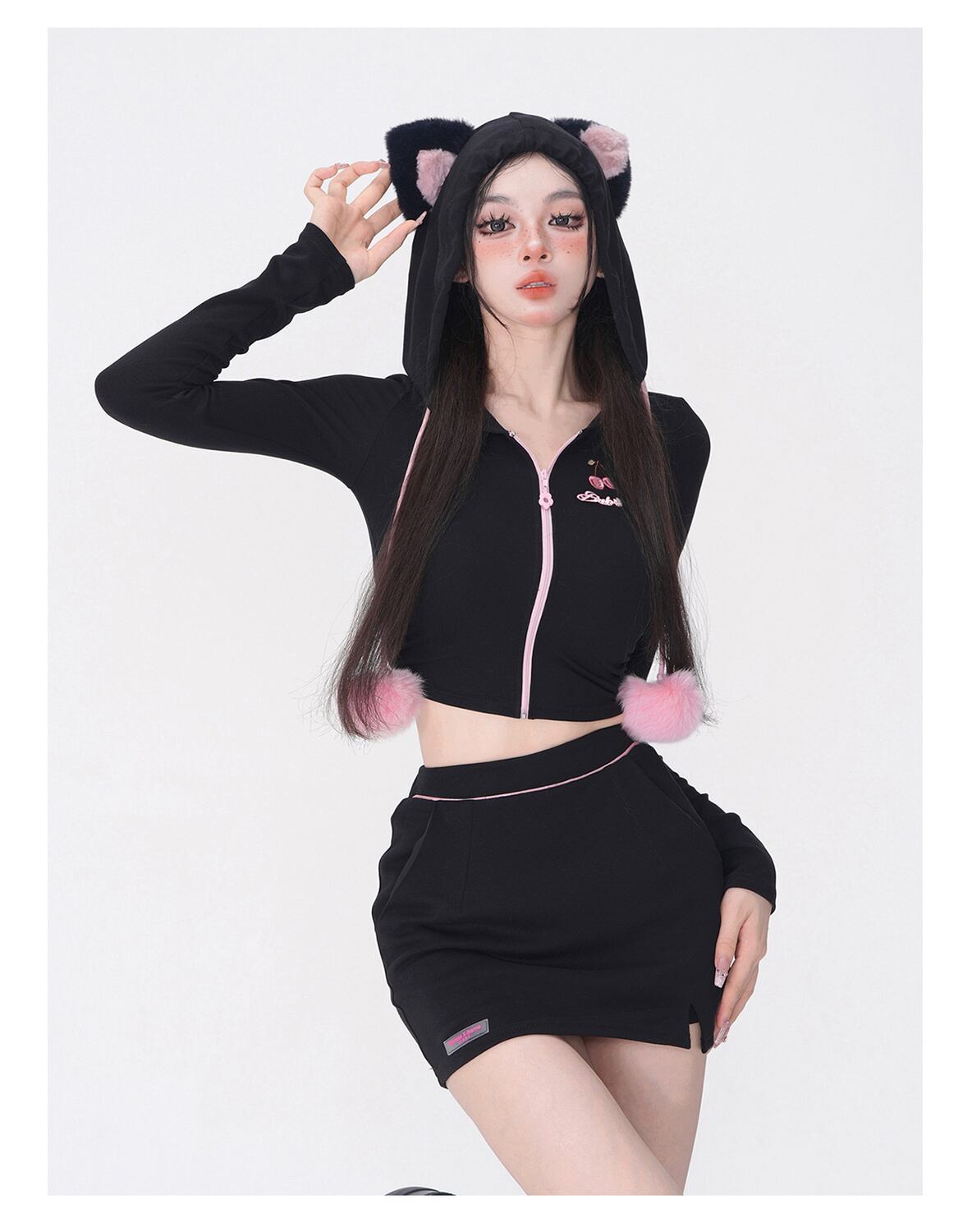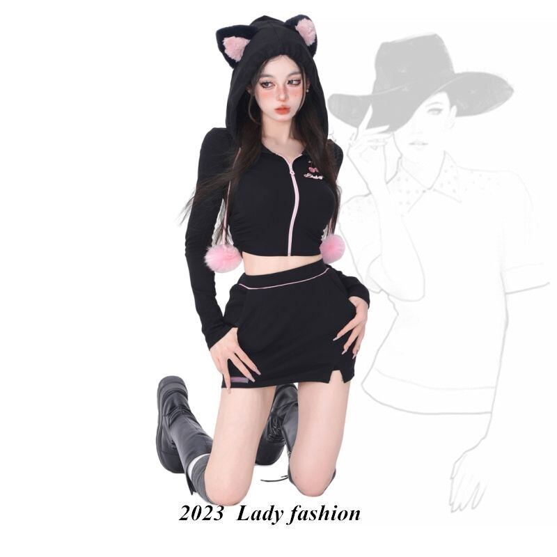 甘いホットガール黒スーツ秋/冬猫耳フード付きジッパー付きコートウエストショートスカートツーピースセット服 レッド ブラック 大人ガーリー スウィート キュート カジュアル オータム 秋物 ウィンター 冬物