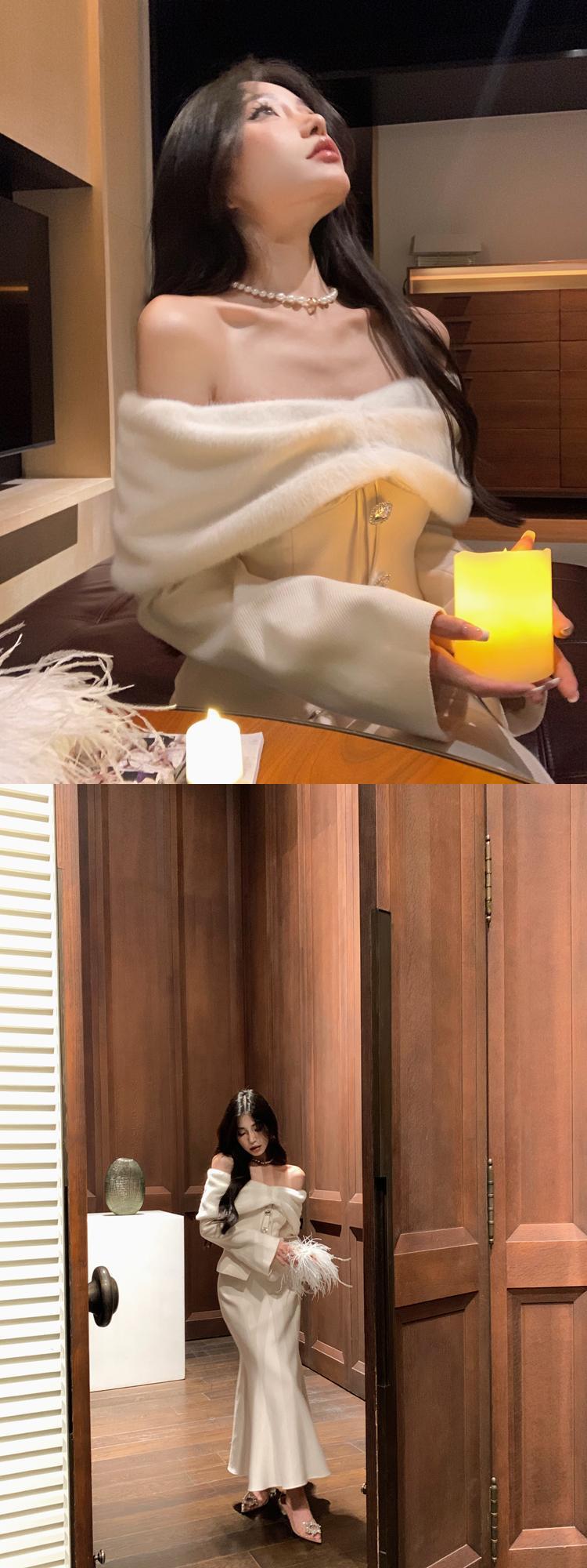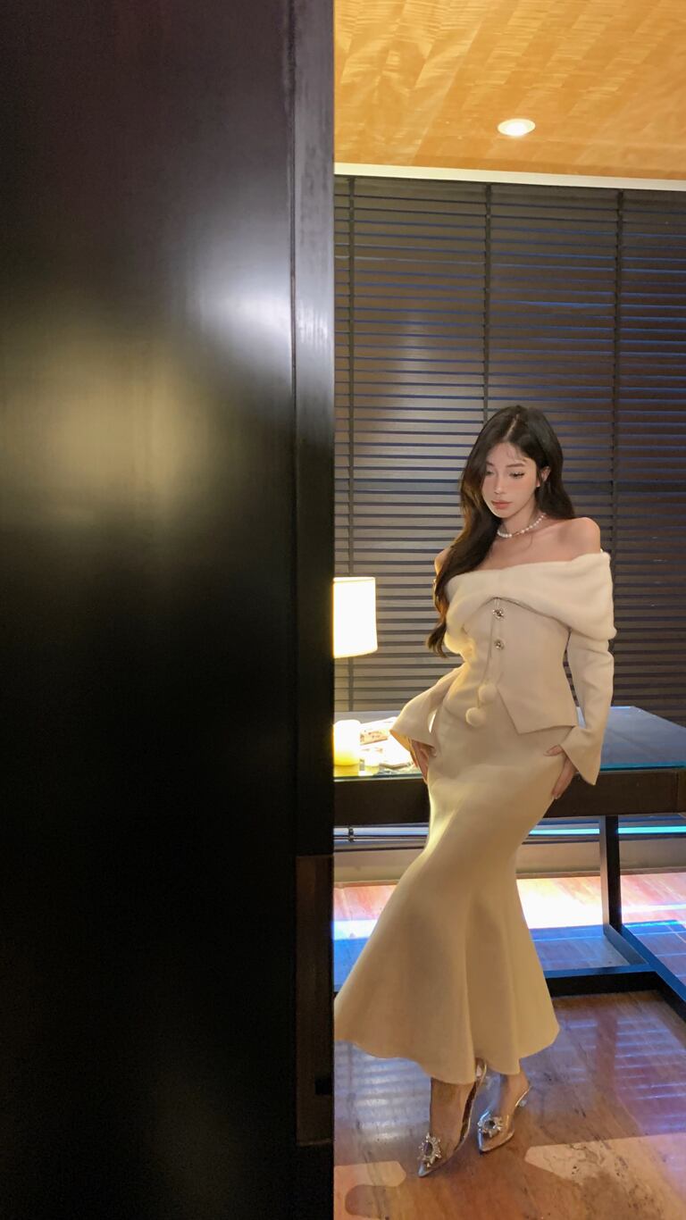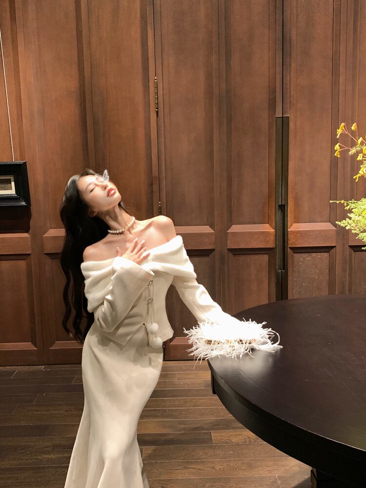 甘いホットガールセクシースーツ秋白オフショルダー長袖ニットシャツミディアム丈マーメイドスカート 2 点セット ロング ホワイト 大人ガーリー スウィート キュート カジュアル オータム 秋物