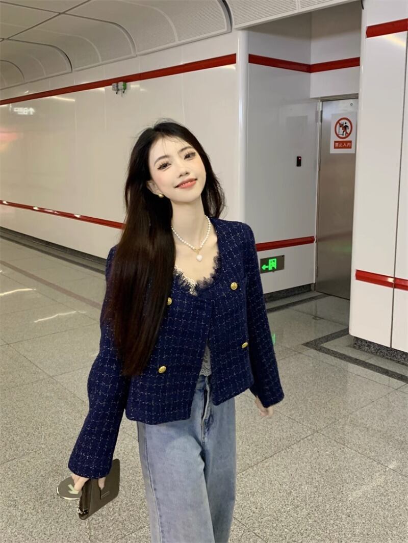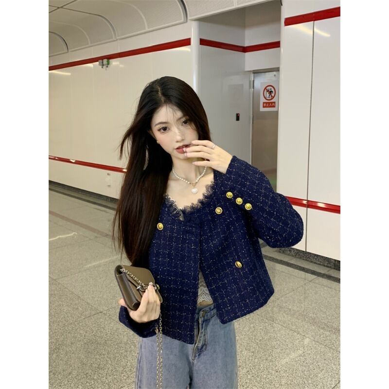 甘いホットガールレトロチェック柄ジャケット秋 O ネックレースパッチワークルーズショートコートトップ服 大人ガーリー スウィート キュート カジュアル オータム 秋物 Oネック シルク