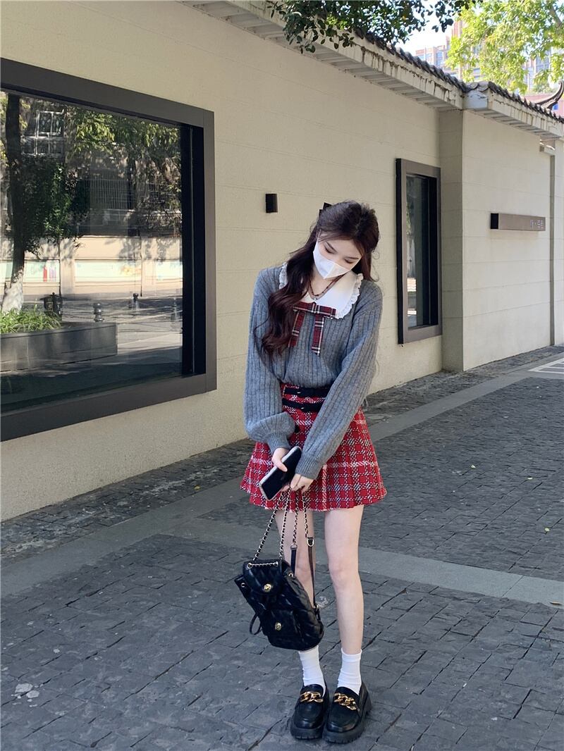 ホットガールプレッピースタイルスーツ秋ターンダウン襟リボンニットトップウエストプリーツスカートツーピースセット服 オータム 秋物