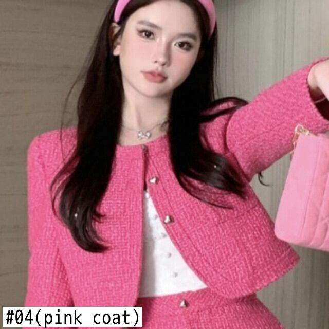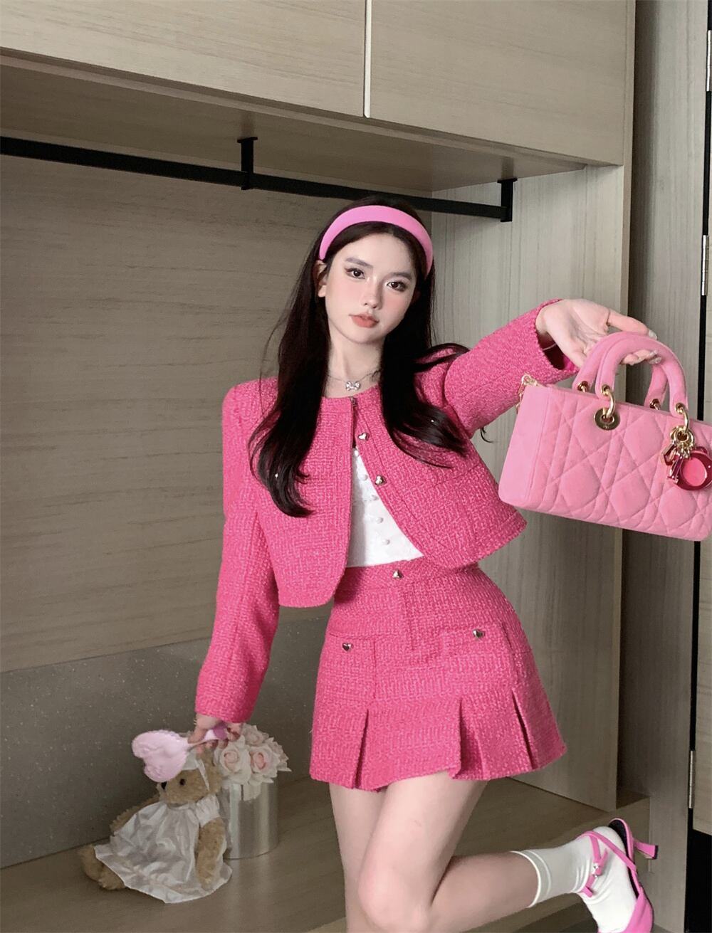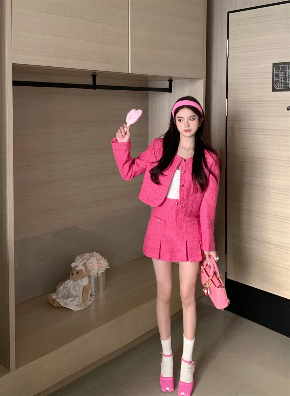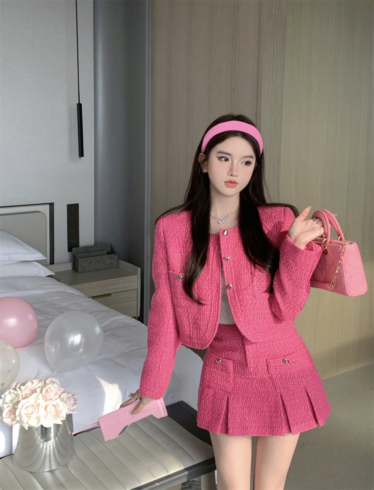 甘いホットガールスーツ秋ピンク O ネックショートコートウエストプリーツミニスカート 2 点セット服 大人ガーリー スウィート キュート カジュアル オータム 秋物 Oネック