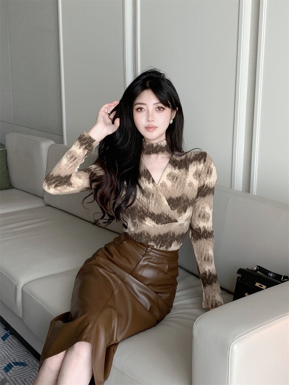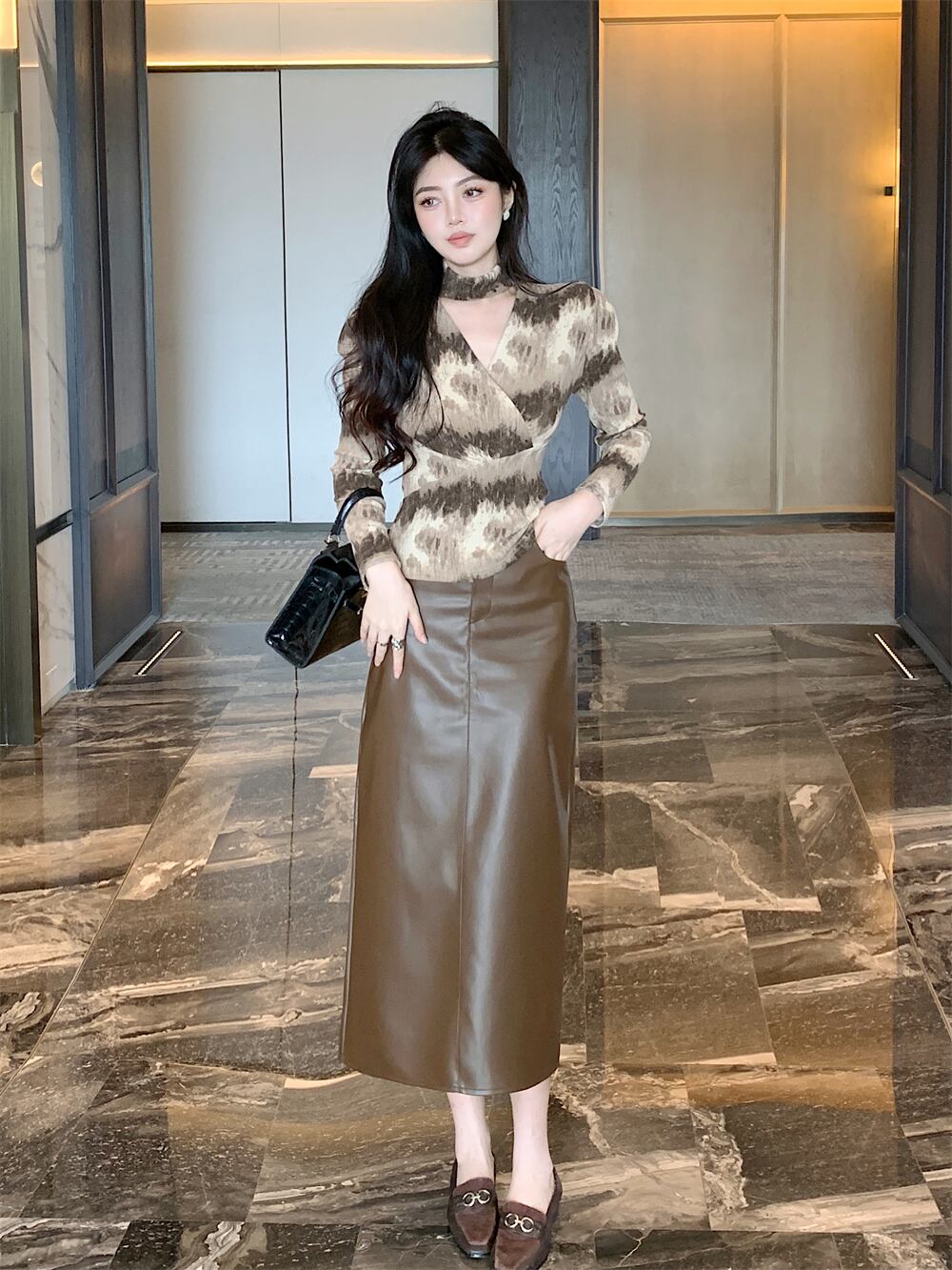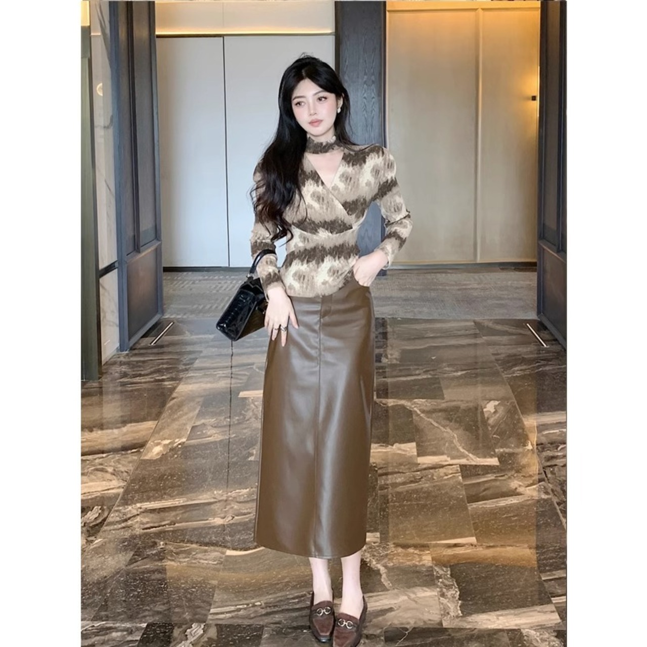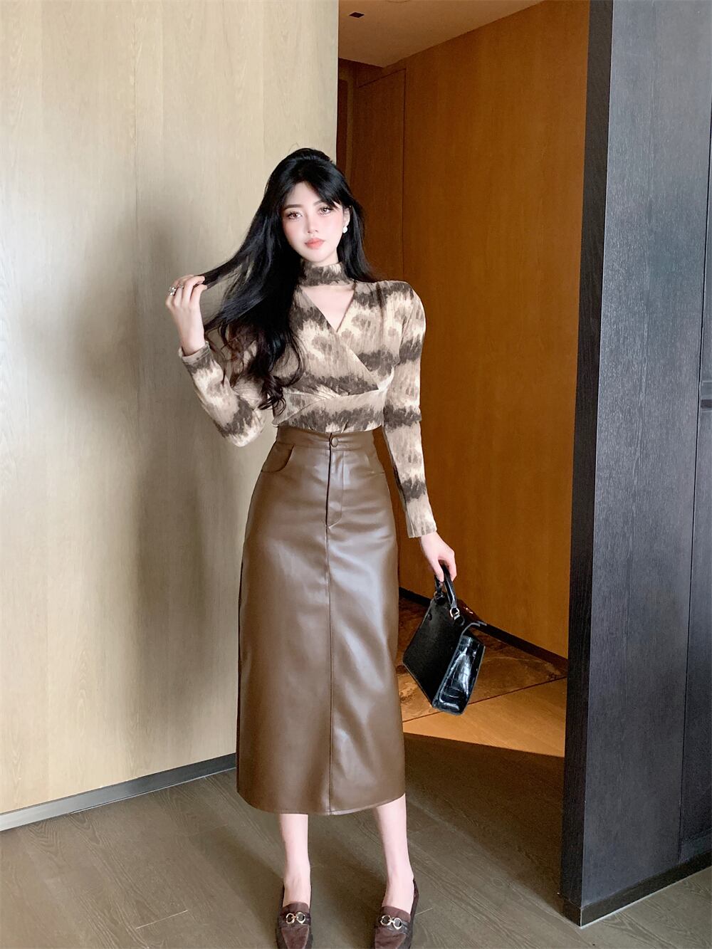 フレンチスイートホットガールスーツ秋冬バブルスリーブ中空アウトシャツコーヒーロングスカート2点セット 大人ガーリー スウィート キュート カジュアル オータム 秋物 ウィンター 冬物