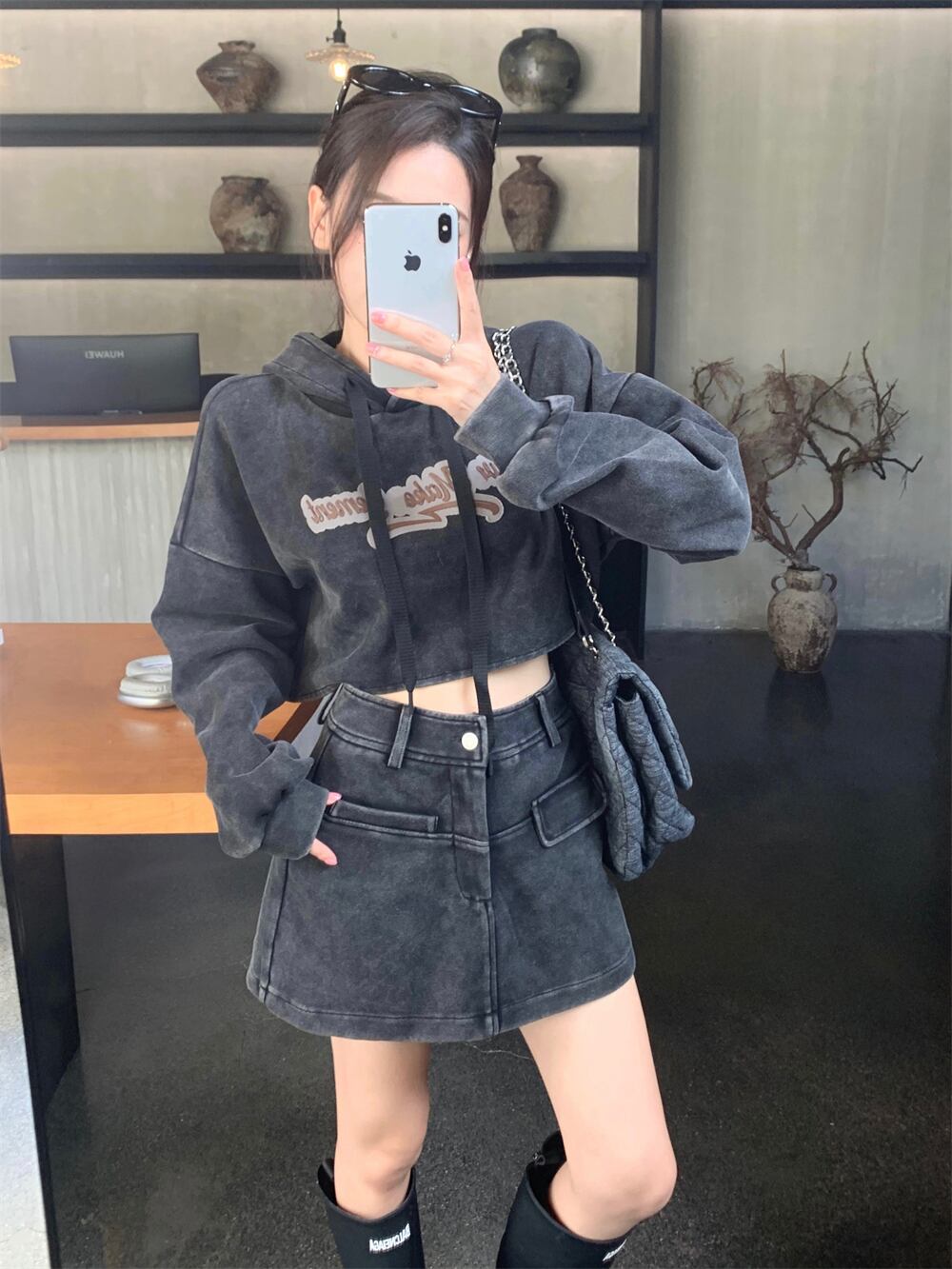 ホットガールスーツ秋ウォッシュオールドフード付きレタープリントスウェットシャツウエストミニスカートツーピースセット服 オータム 秋物