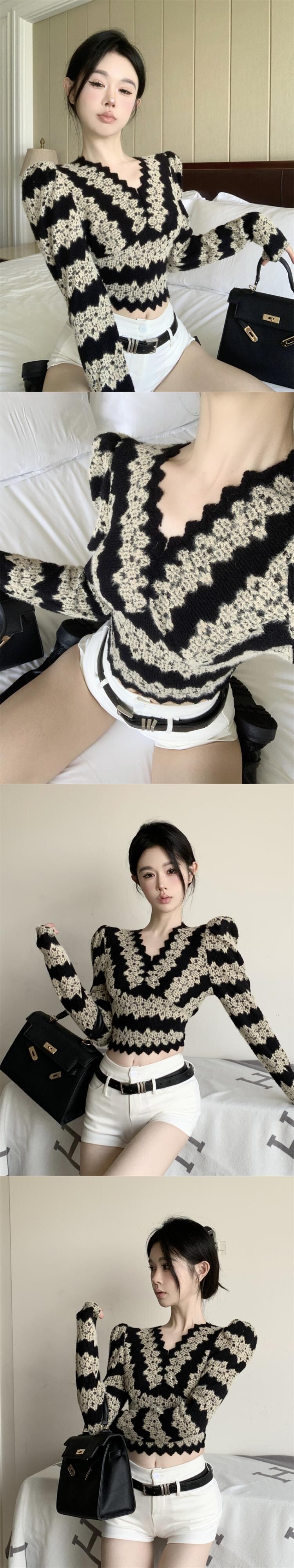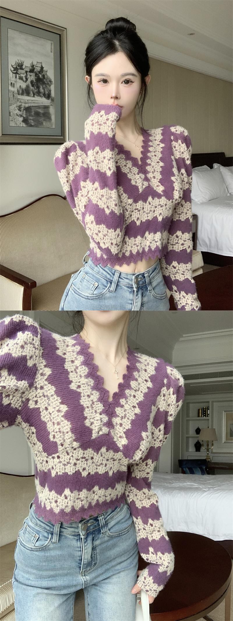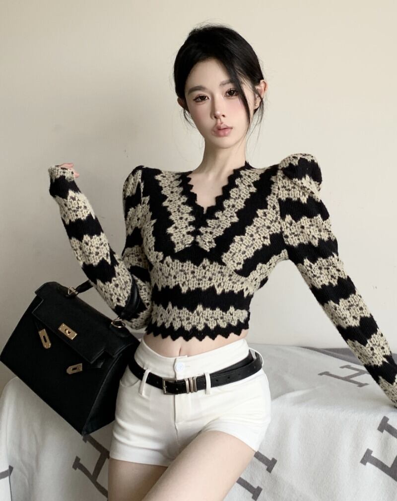 甘いホットガールセクシー中空レースシャツ秋多用途スリムフィット V ネックバブルスリーブ下敷きトップ服 大人ガーリー スウィート キュート カジュアル オータム 秋物 Vネック