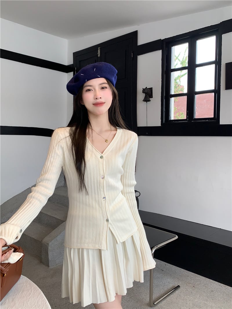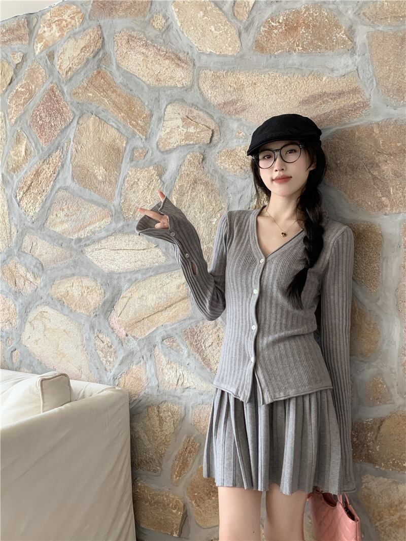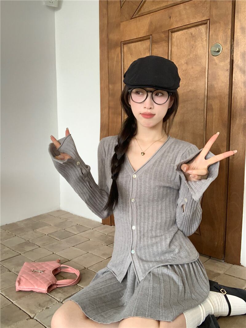 スイートガールスーツ秋グレーピットストライプ V ネックニットカーディガン A ラインプリーツスカート 2 点セット服 大人ガーリー スウィート キュート カジュアル オータム 秋物 Vネック Aライン