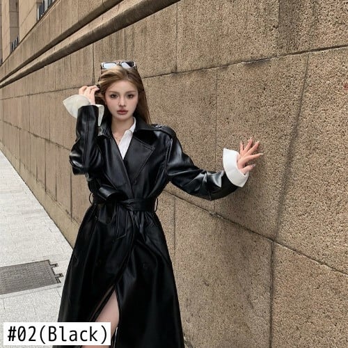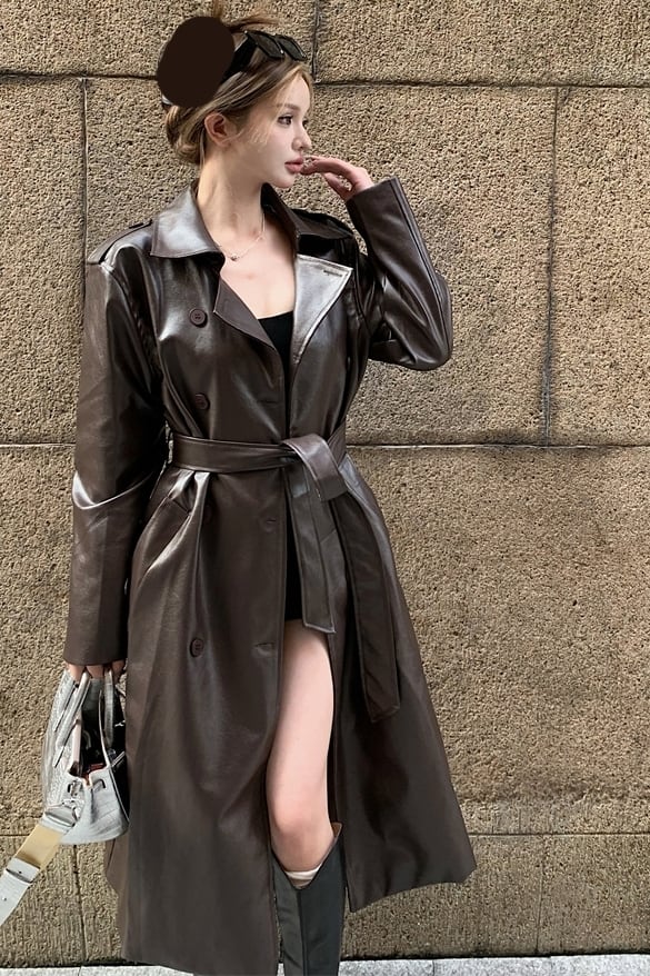 メイラードスタイルレトロ膝丈レザージャケットレディース秋多用途長袖レースアップレザートレンチコート ロング オータム 秋物