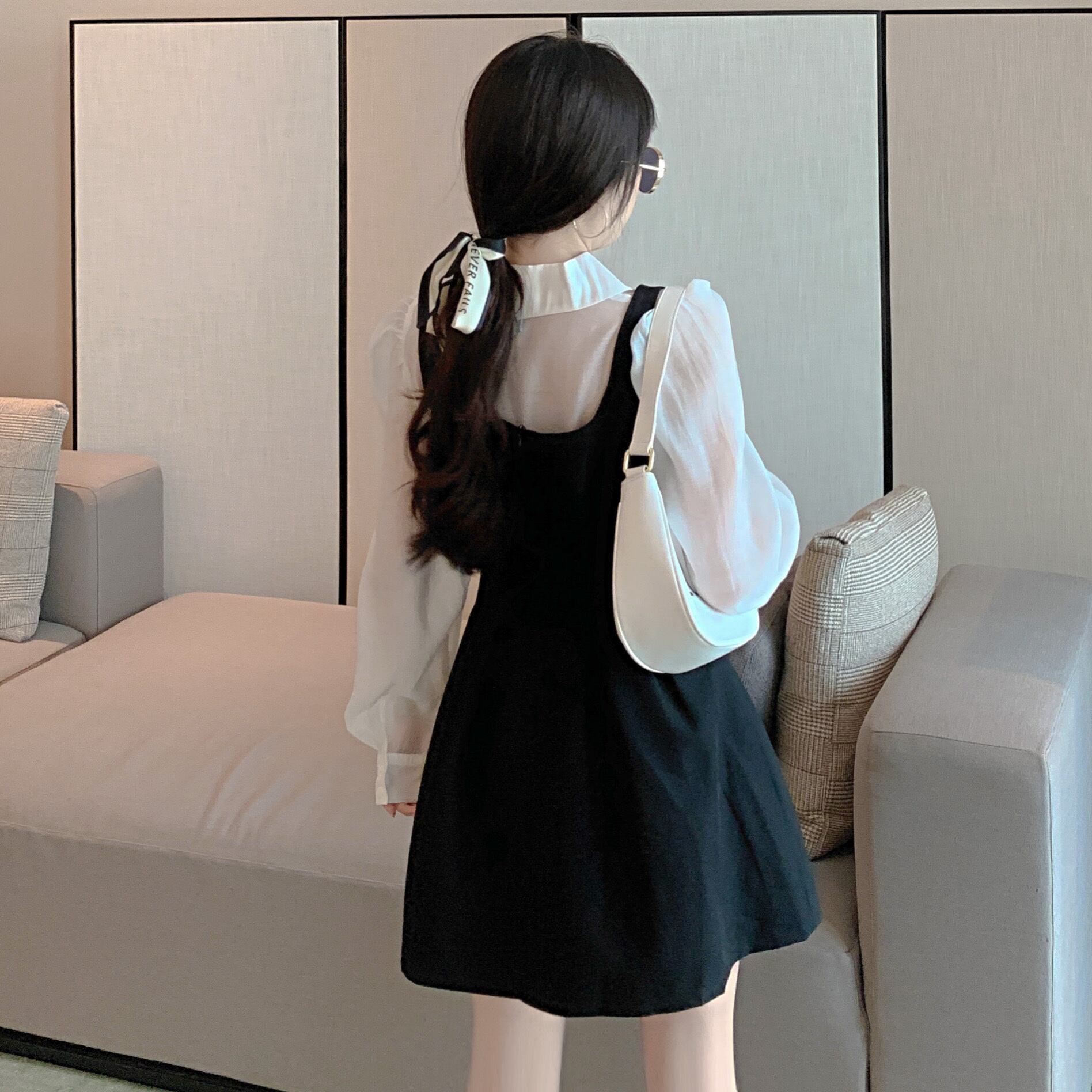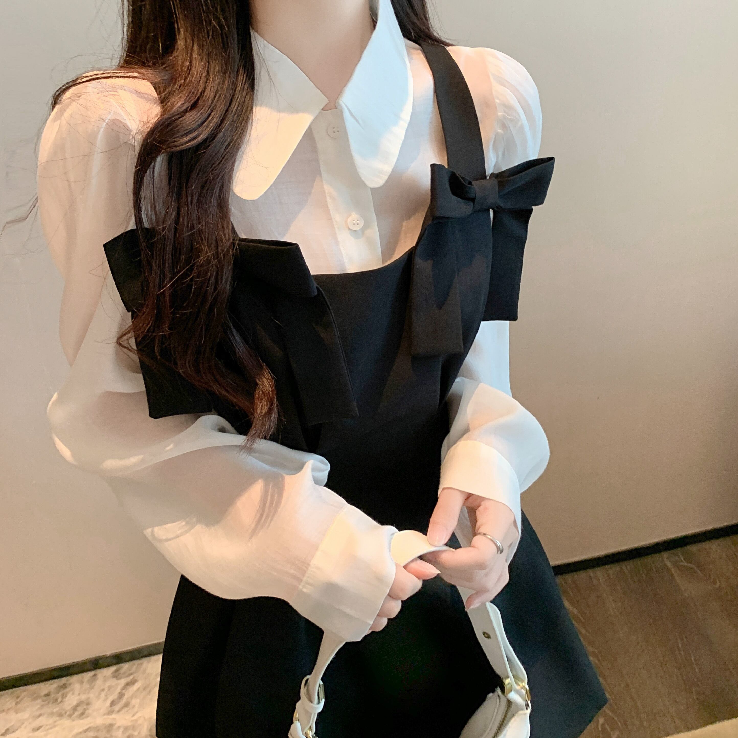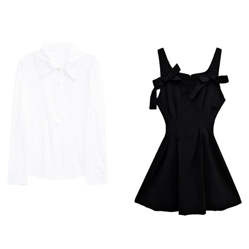 甘いホットガールスーツ秋長袖シャツスリムフィットサスペンダー A ラインドレス 2 点セット服 ロング 大人ガーリー スウィート キュート カジュアル オータム 秋物 Aライン