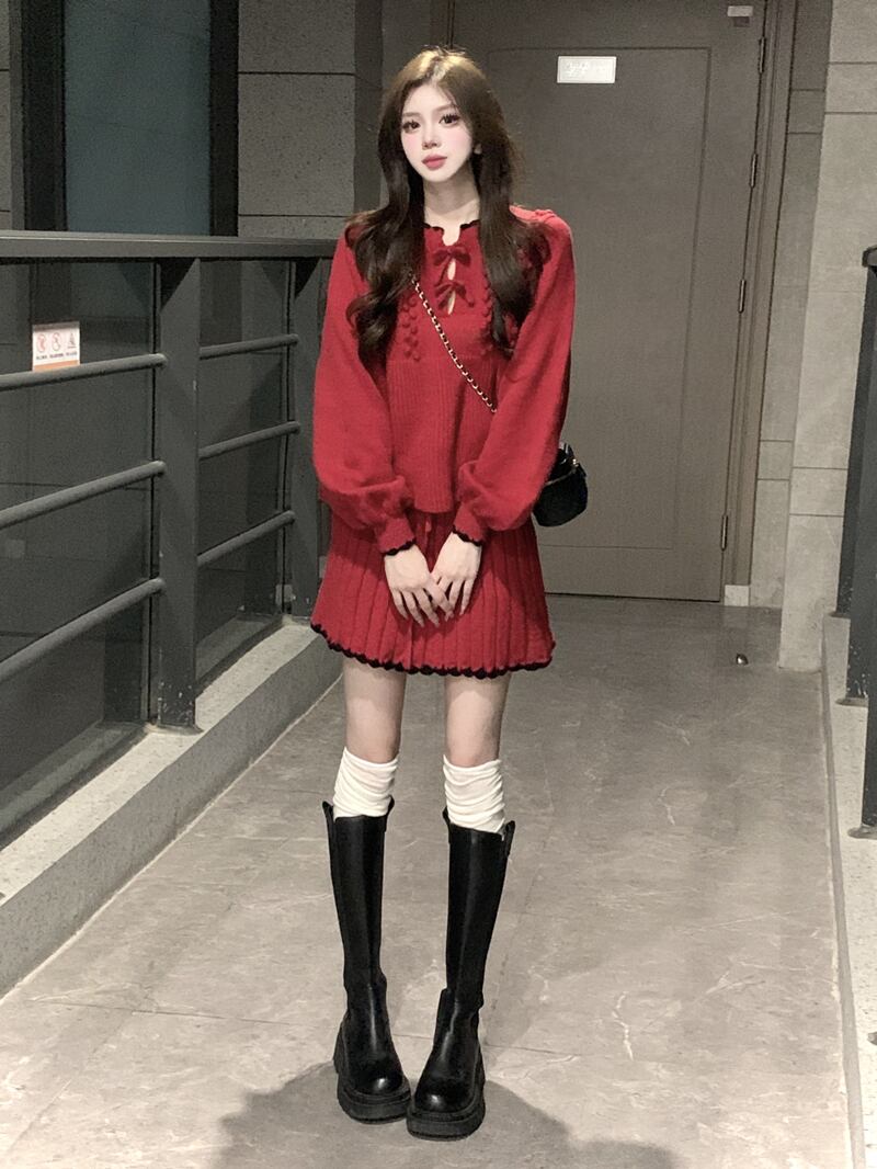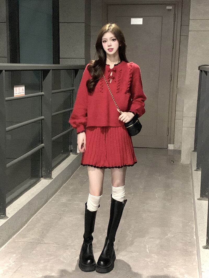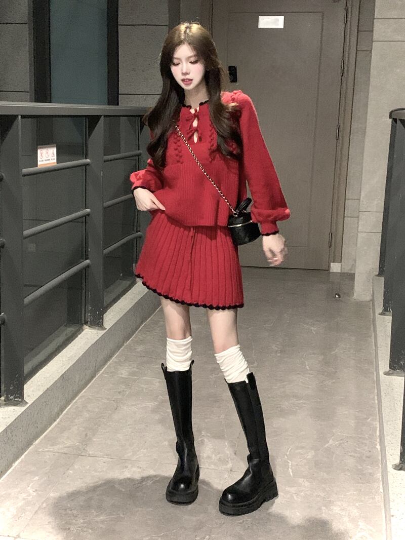 Sweet Girl レッドスーツ レディース 秋 O ネック長袖ニット A ラインプリーツスカート 2 点セット服 ロング 大人ガーリー スウィート キュート カジュアル オータム 秋物 Oネック Aライン