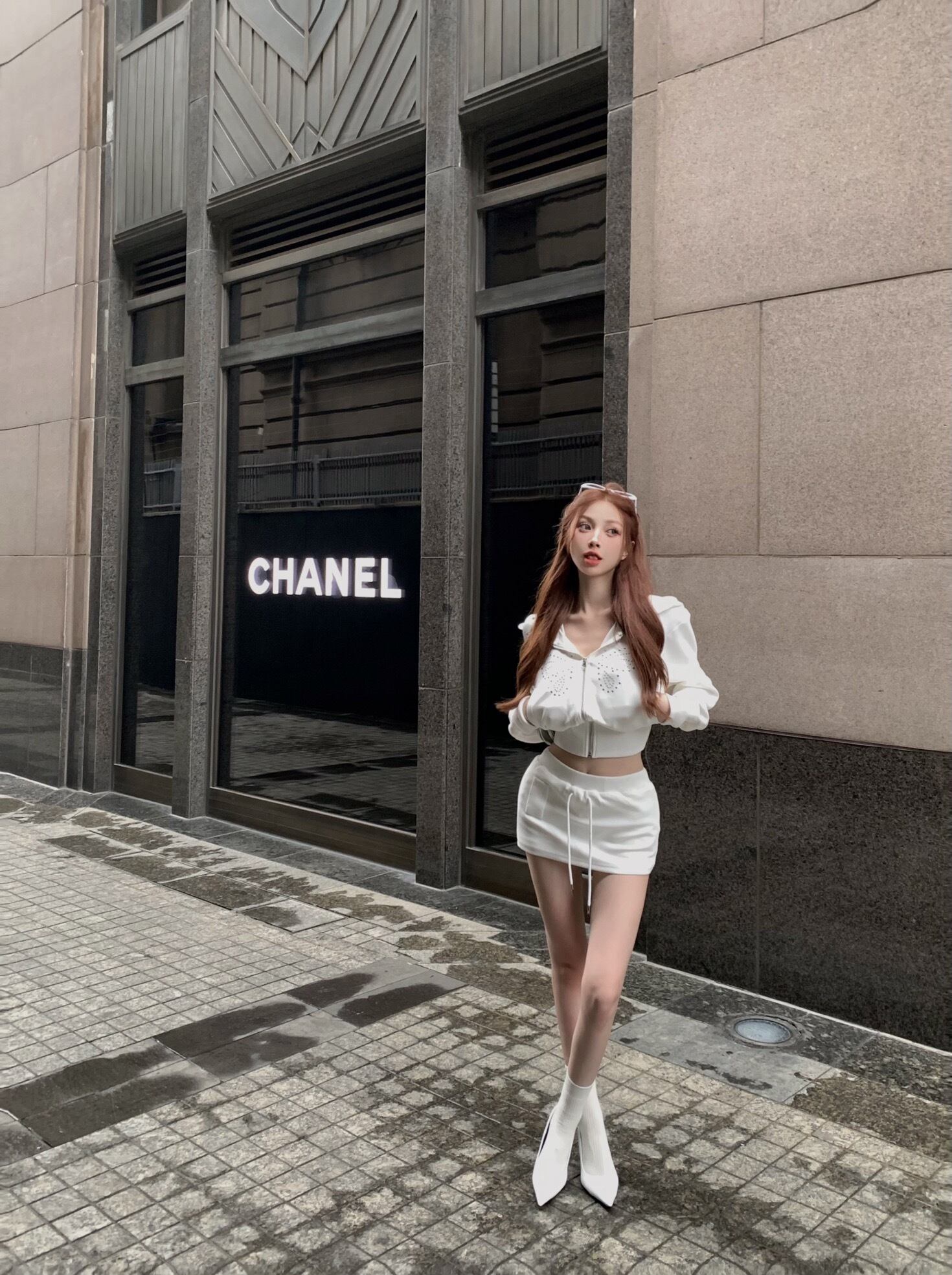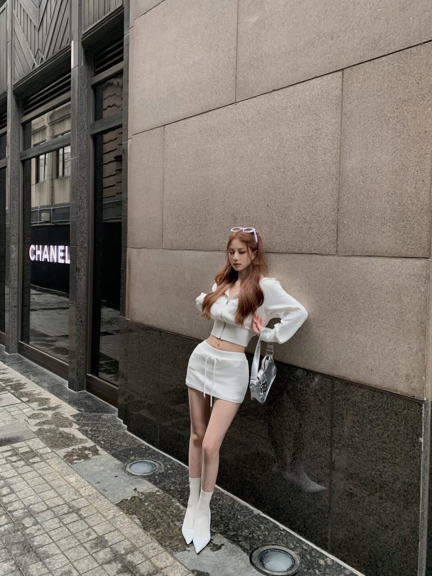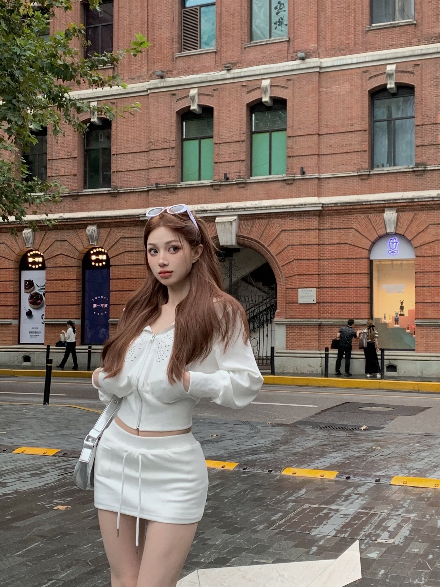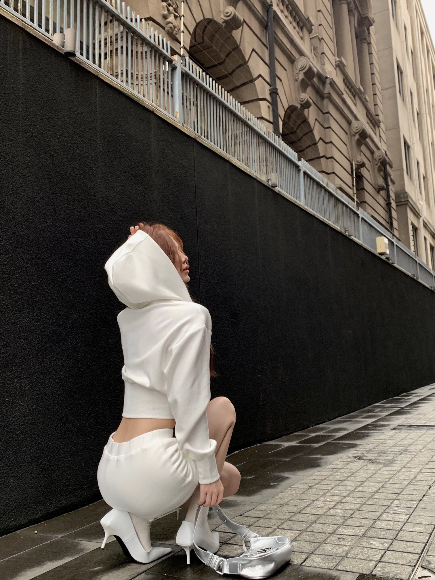 ホットガールスポーツスーツ秋蝶ジッパー白フード付きトレーナーウエストミニスカート 2 点セット ホワイト オータム 秋物