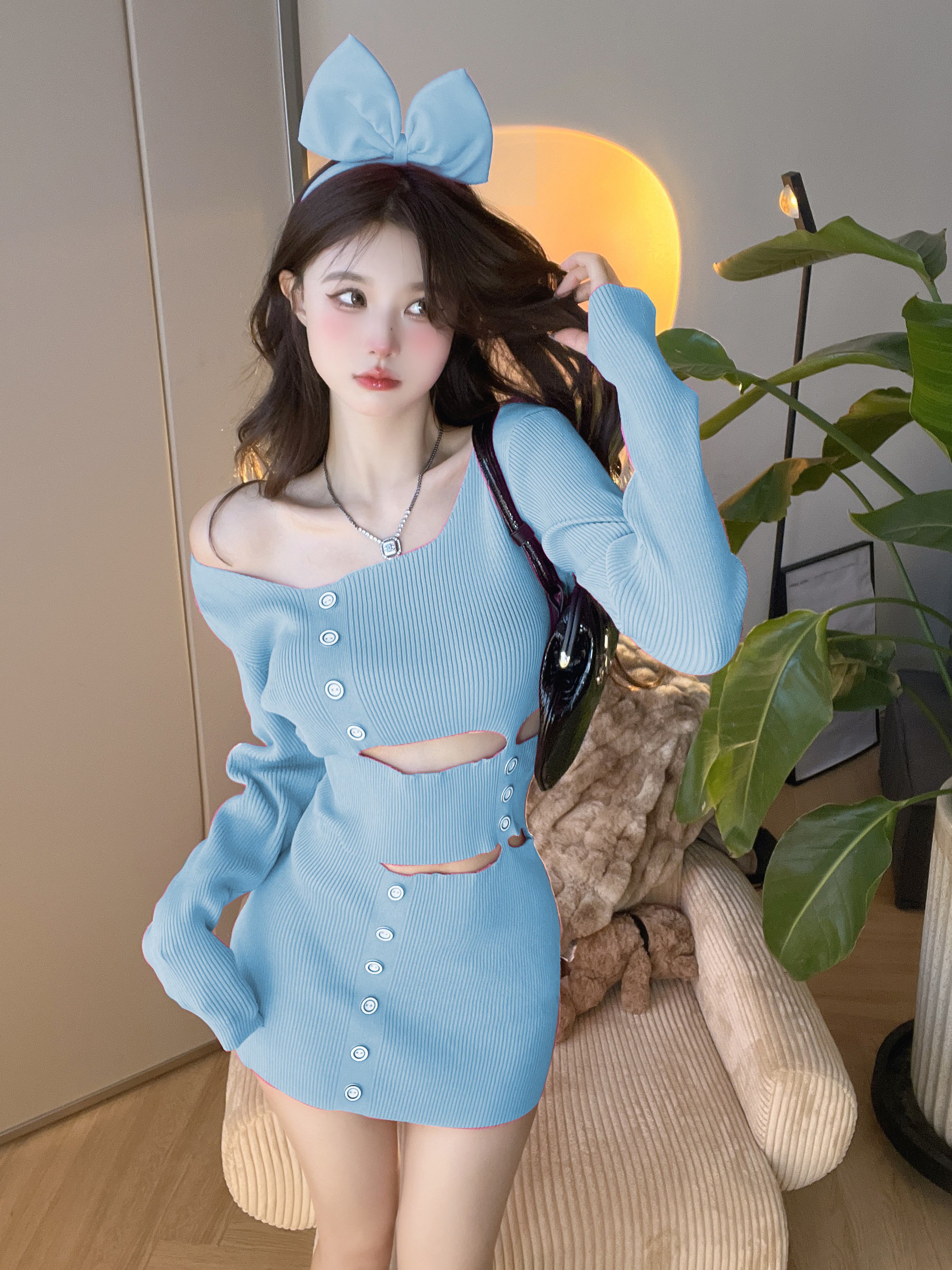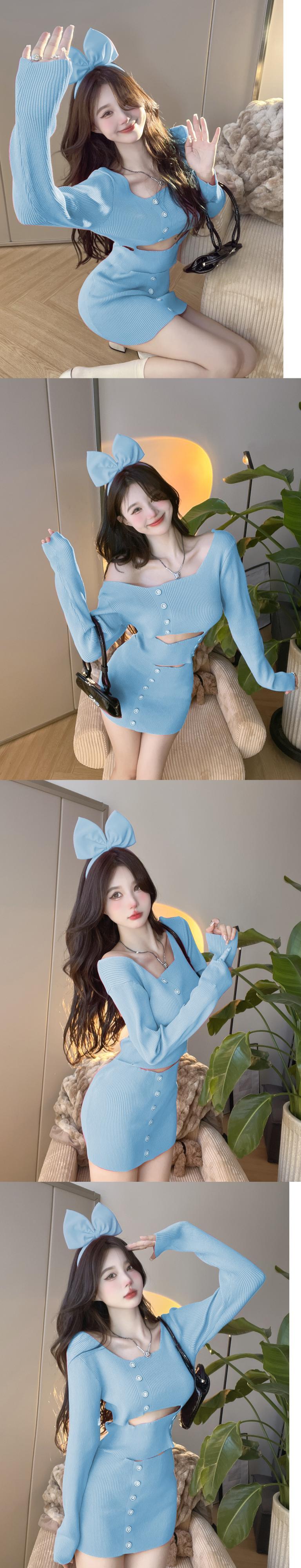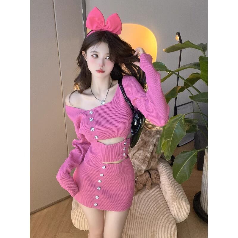 フランス純粋セクシーホットガールセクシーニット長袖ドレス秋スリムフィットオープンウエストラップヒップ中空アウトドレス ロング オータム 秋物 ピュア