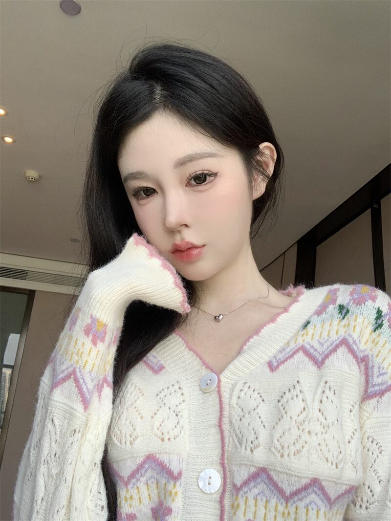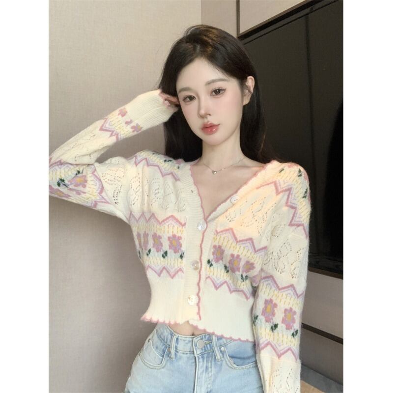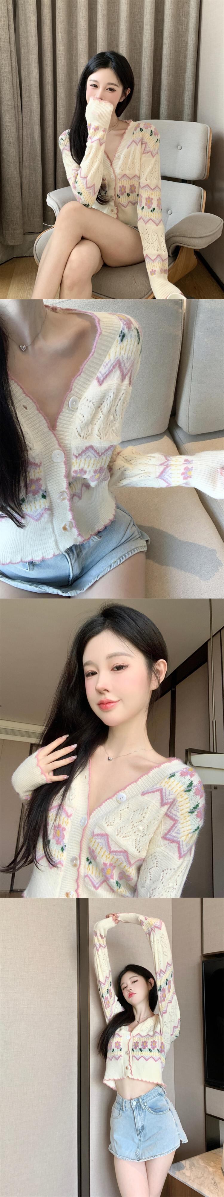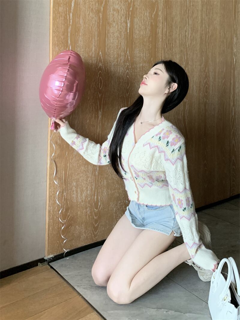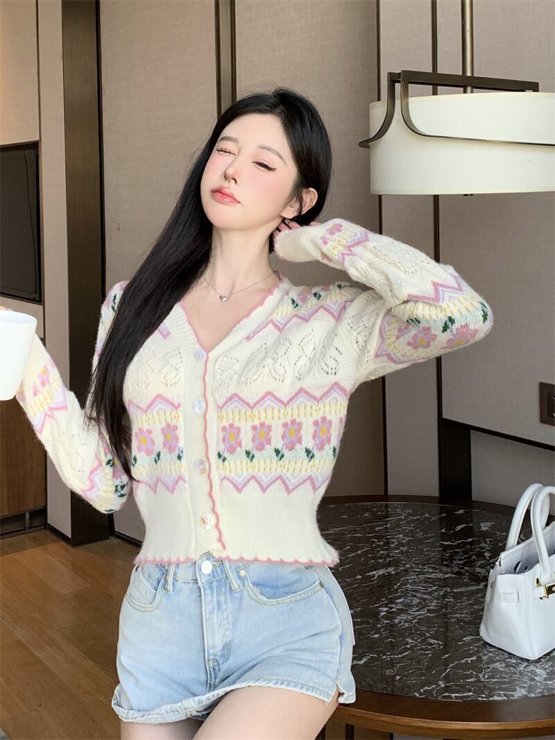 フレンチスイートガール刺繍ジャカードニットカーディガン秋多彩Vネックセーターショートコート服 レッド 大人ガーリー スウィート キュート カジュアル オータム 秋物