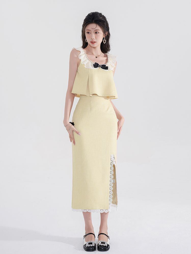 スウィートガールスーツ レディース フリルエッジ ノースリーブ ルーズトップ ウエストスプリットレース ミドル丈スカート 2点セット 大人ガーリー キュート カジュアル