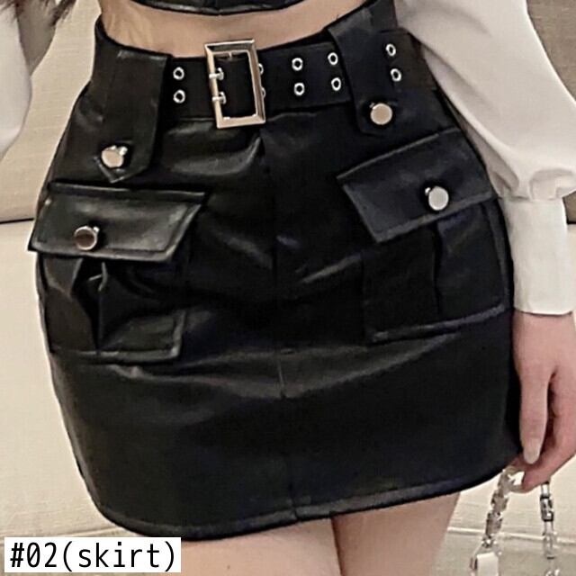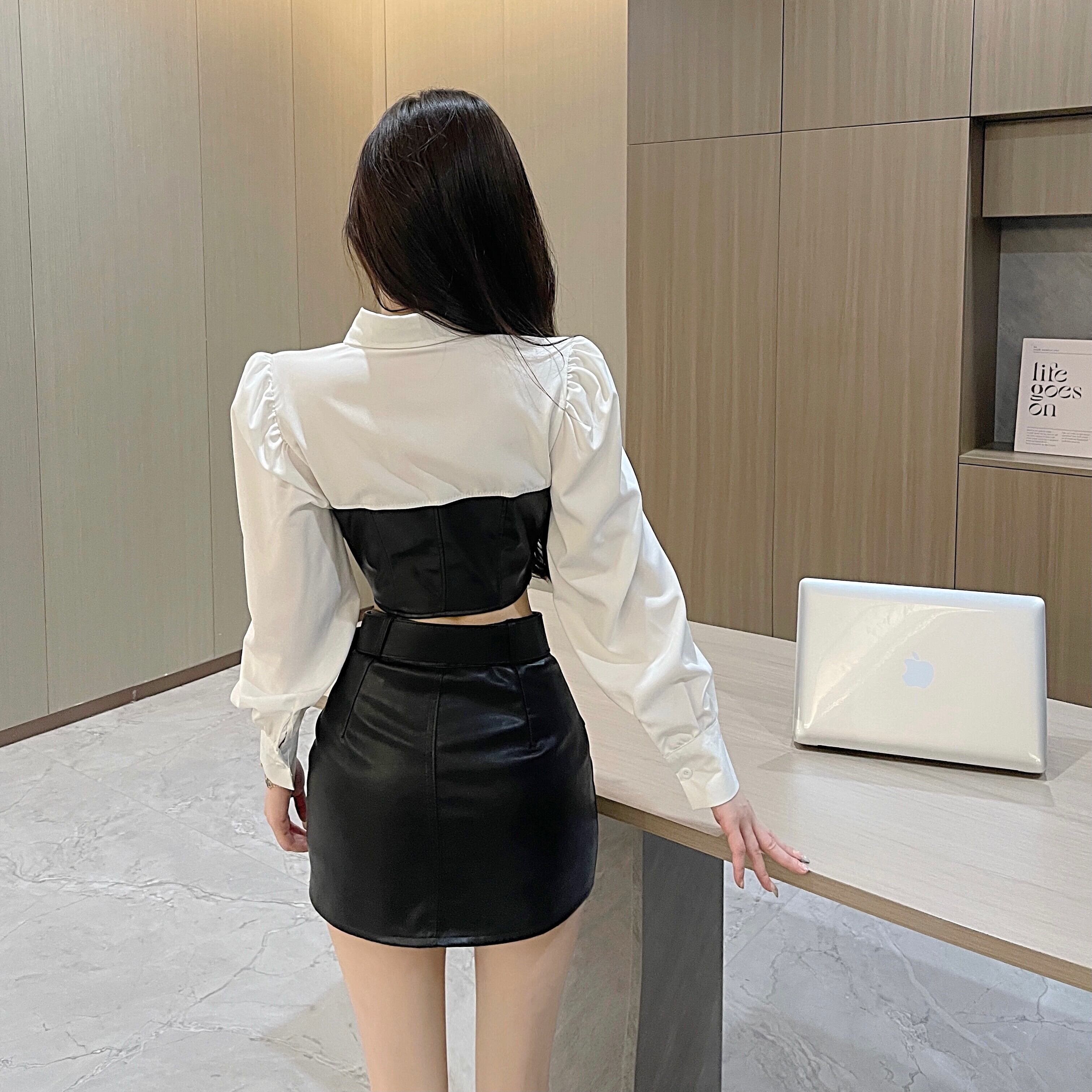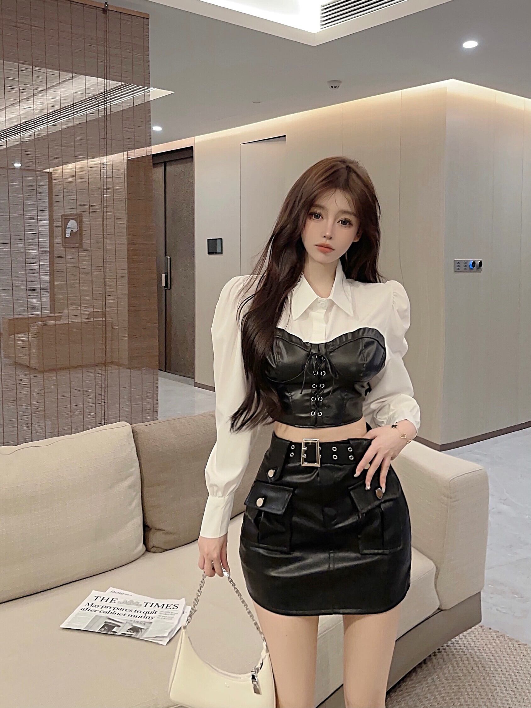 スイートガールスーツ秋スプライス長袖シャツトップウエストレザーミニスカート 2 点セット服 ロング 大人ガーリー スウィート キュート カジュアル オータム 秋物