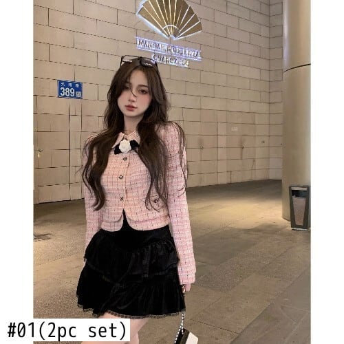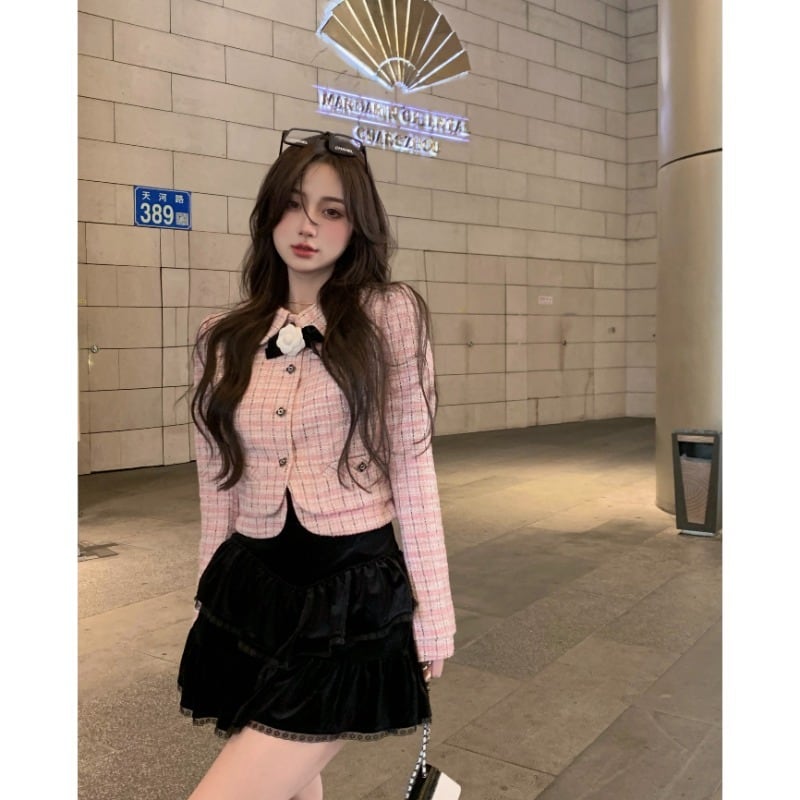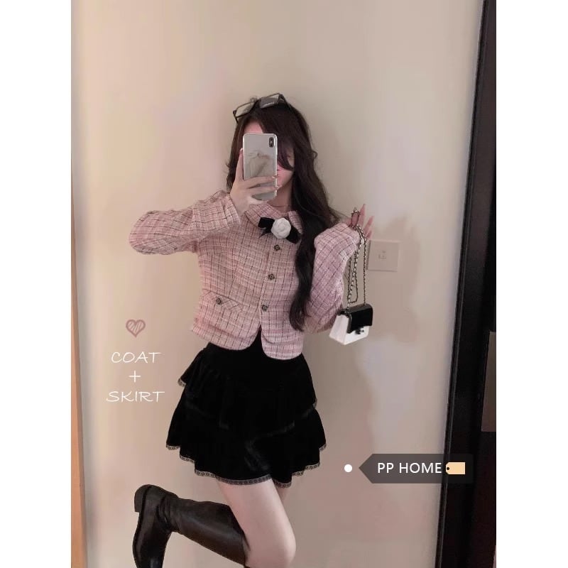 スイートガールスーツ秋ピーターパン襟ショートコート黒ベルベットケーキショートスカートツーピースセット服 ブラック 大人ガーリー スウィート キュート カジュアル オータム 秋物