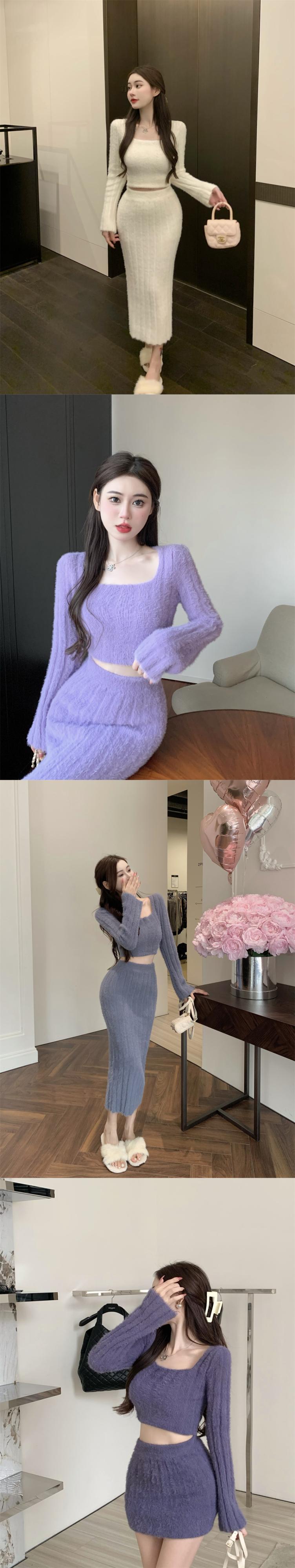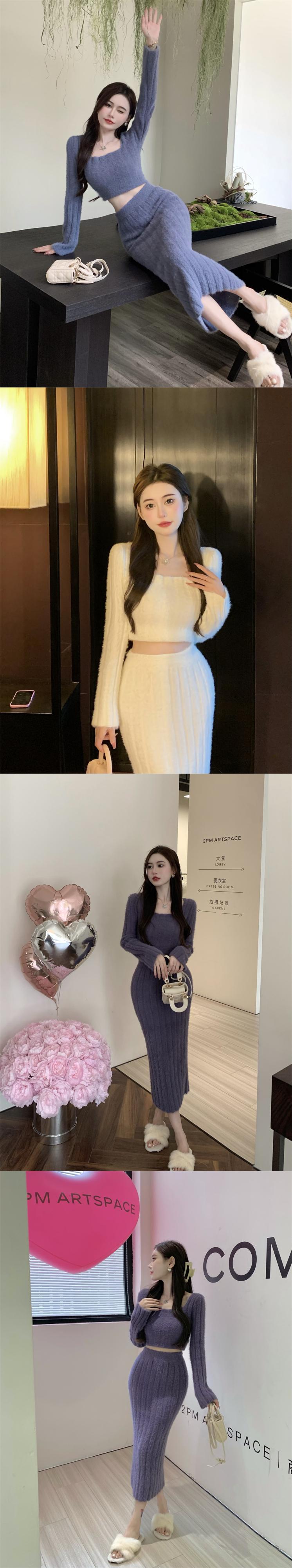 フランスぬいぐるみスーツ冬スリムフィット肥厚ニットウエストラップヒップロングスカートツーピースセット服 ウィンター 冬物
