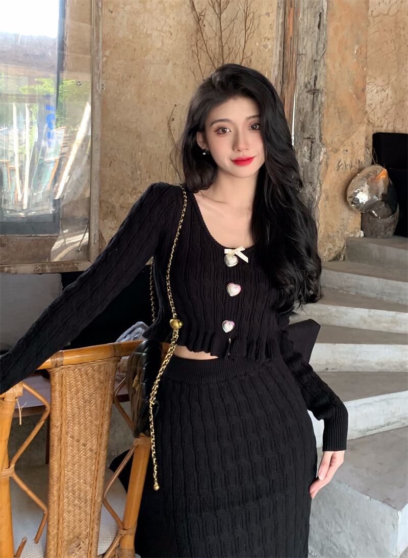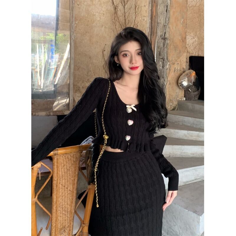 甘いホットガールニットスーツ秋ツイストセーターカーディガンヒップラップスカートツーピースセット服 大人ガーリー スウィート キュート カジュアル オータム 秋物