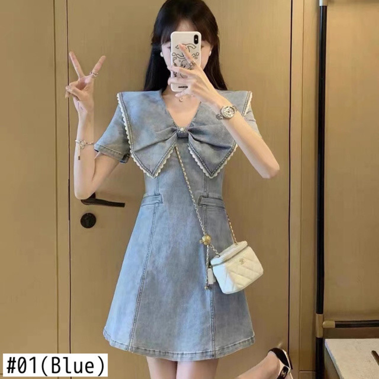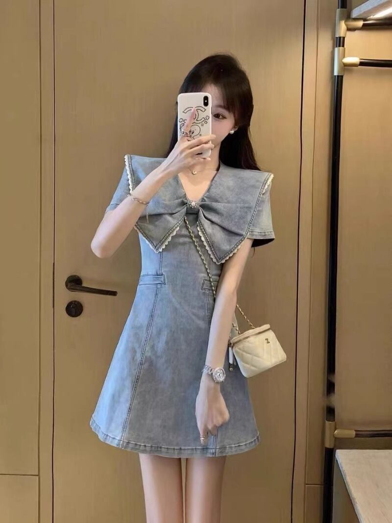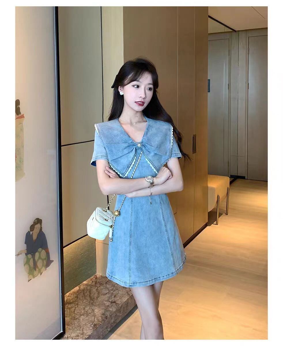 フレンチスタイルホットガールフリル襟デニムドレス夏半袖スリムフィットレトロAラインスカート服 サマー 夏物
