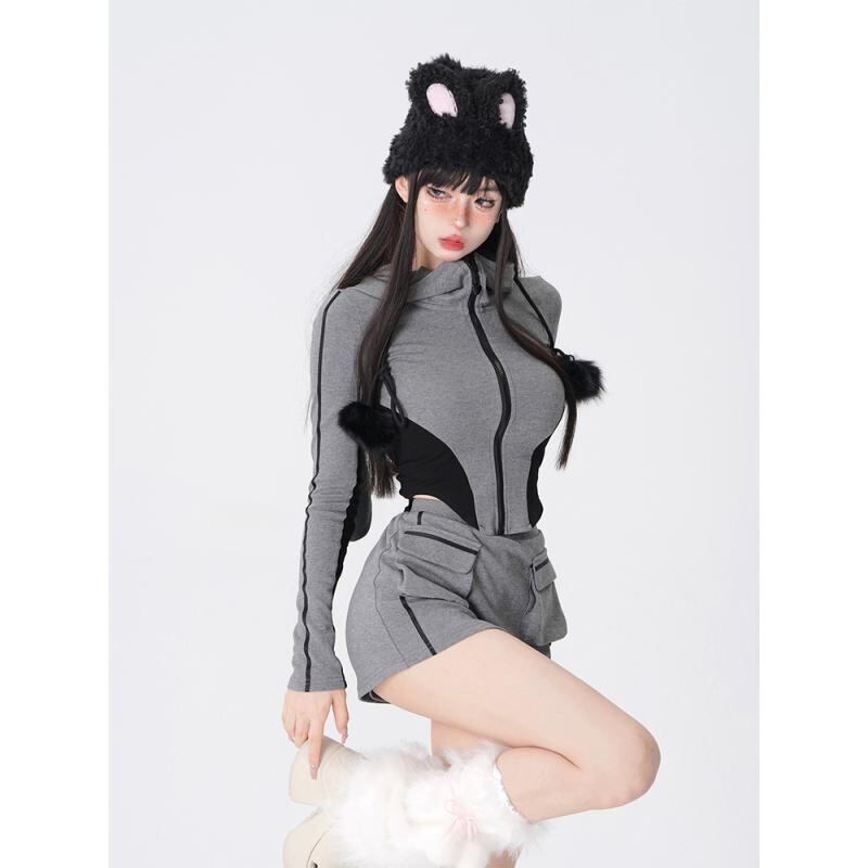 甘いホットガールグレースーツ秋スリムフィットフード付きジッパー付きトレーナー A ラインショートスカート 2 点セット服 レッド 大人ガーリー スウィート キュート カジュアル オータム 秋物 Aライン