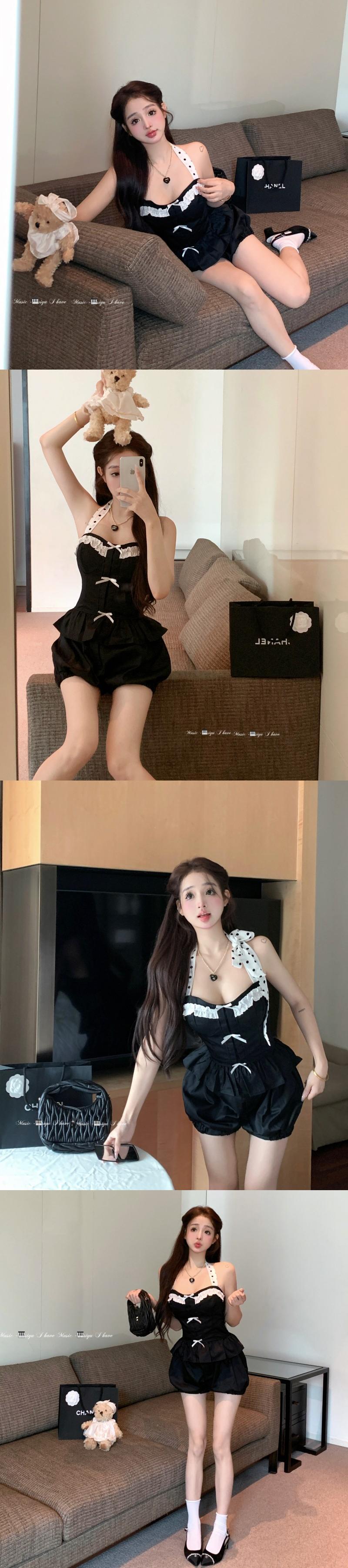 セクシーホットガールスーツ夏ドットスリムホルターネックサスペンダートップウエスト弾性ブルマツーピースセット服 エラスティック 伸縮 サマー 夏物 ショーツ ブルマー