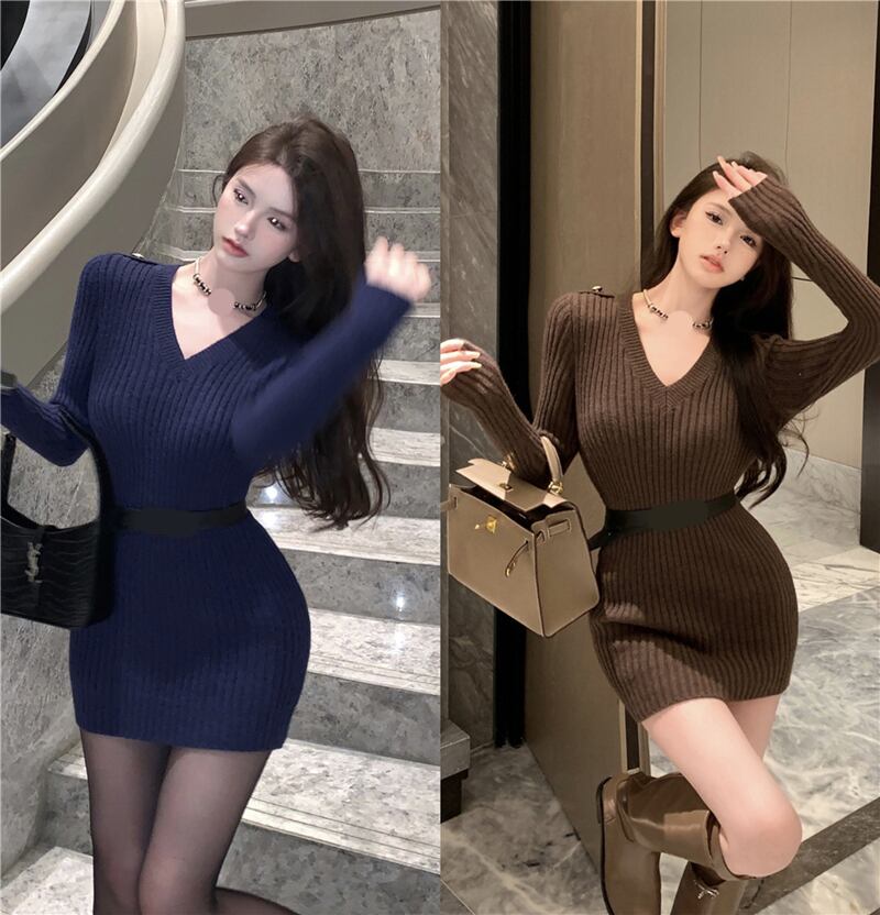 甘いホットガール V ネックニットドレス秋フレンチスタイルセクシースリムフィットラップヒップショートドレス服 大人ガーリー スウィート キュート カジュアル オータム 秋物 Vネック