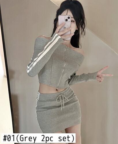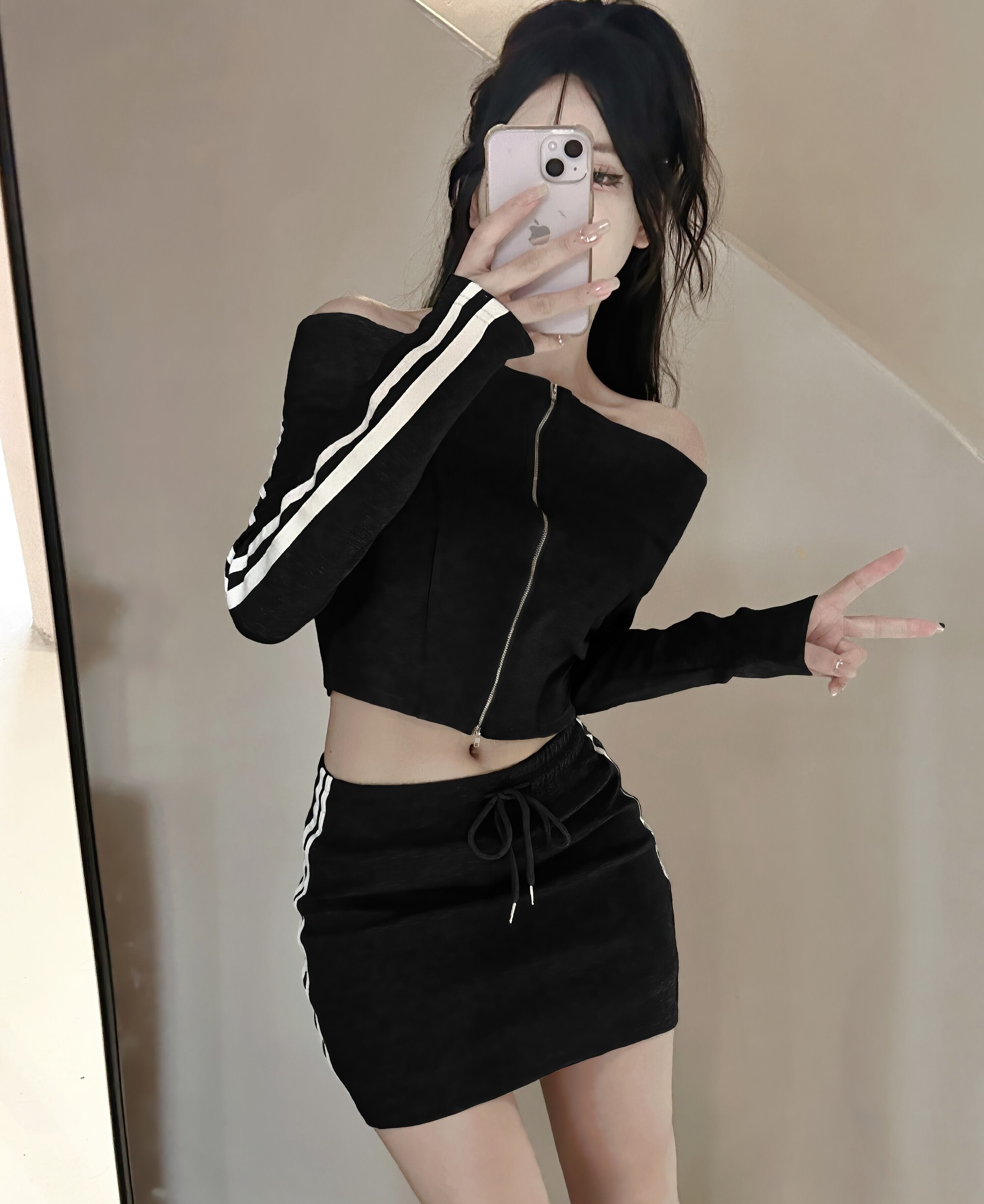 ホットガールスポーツスーツ秋オフショルダー長袖トップウエストラップヒップミニスカートツーピースセット ロング オータム 秋物