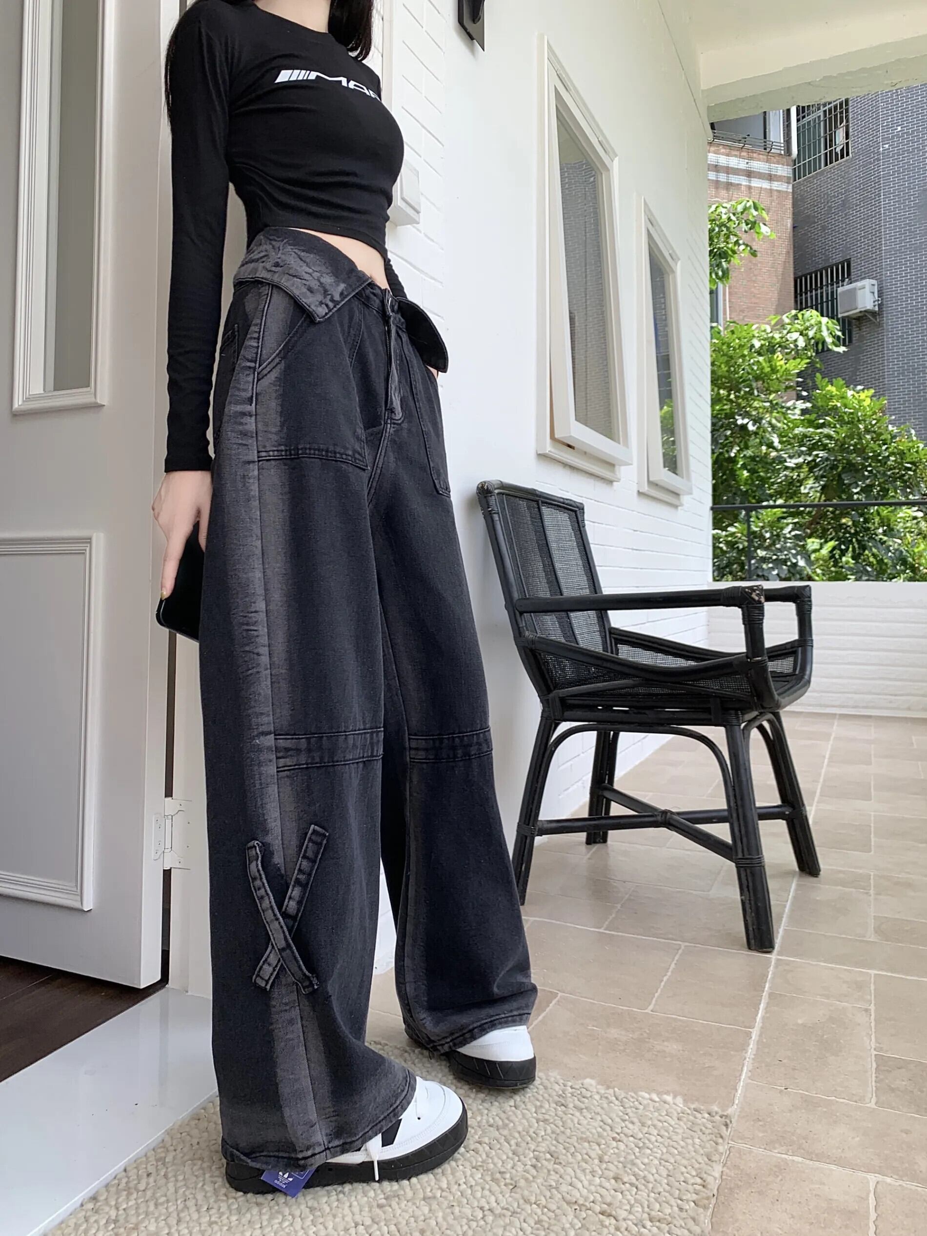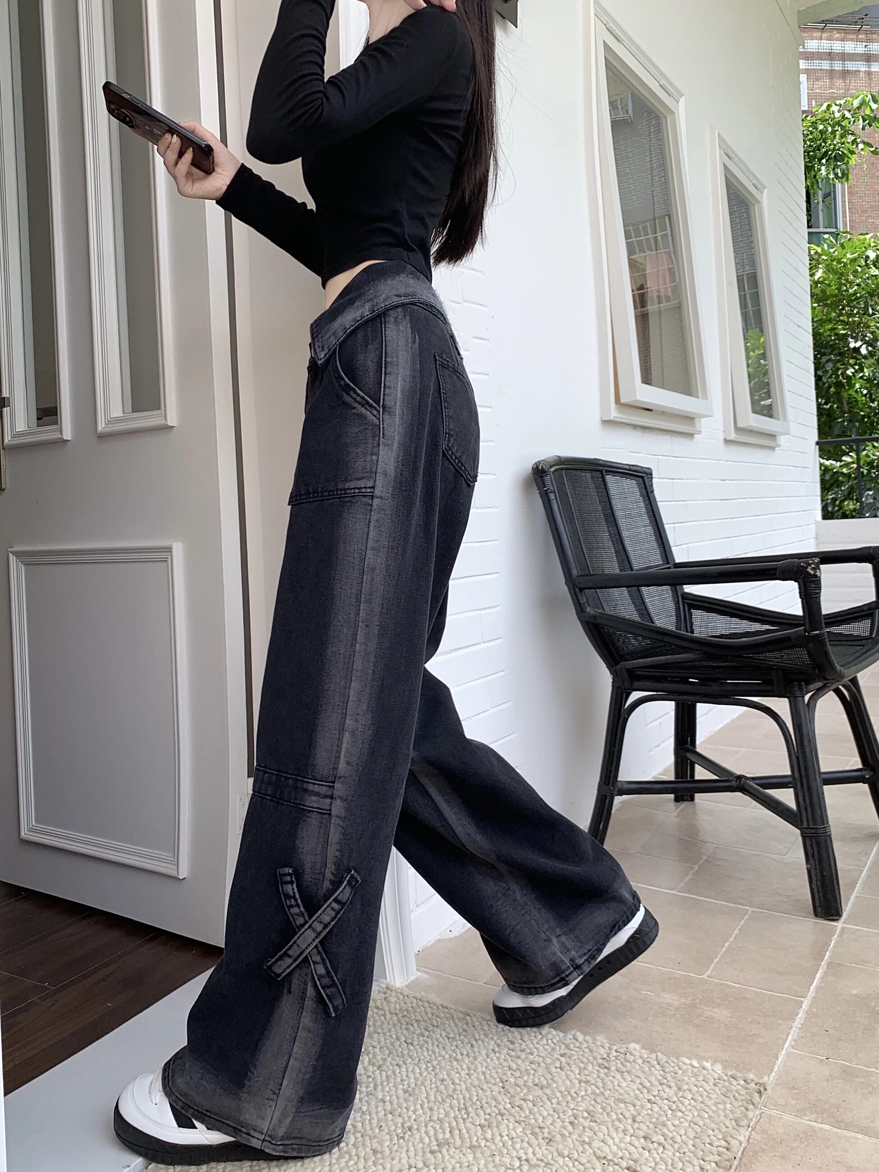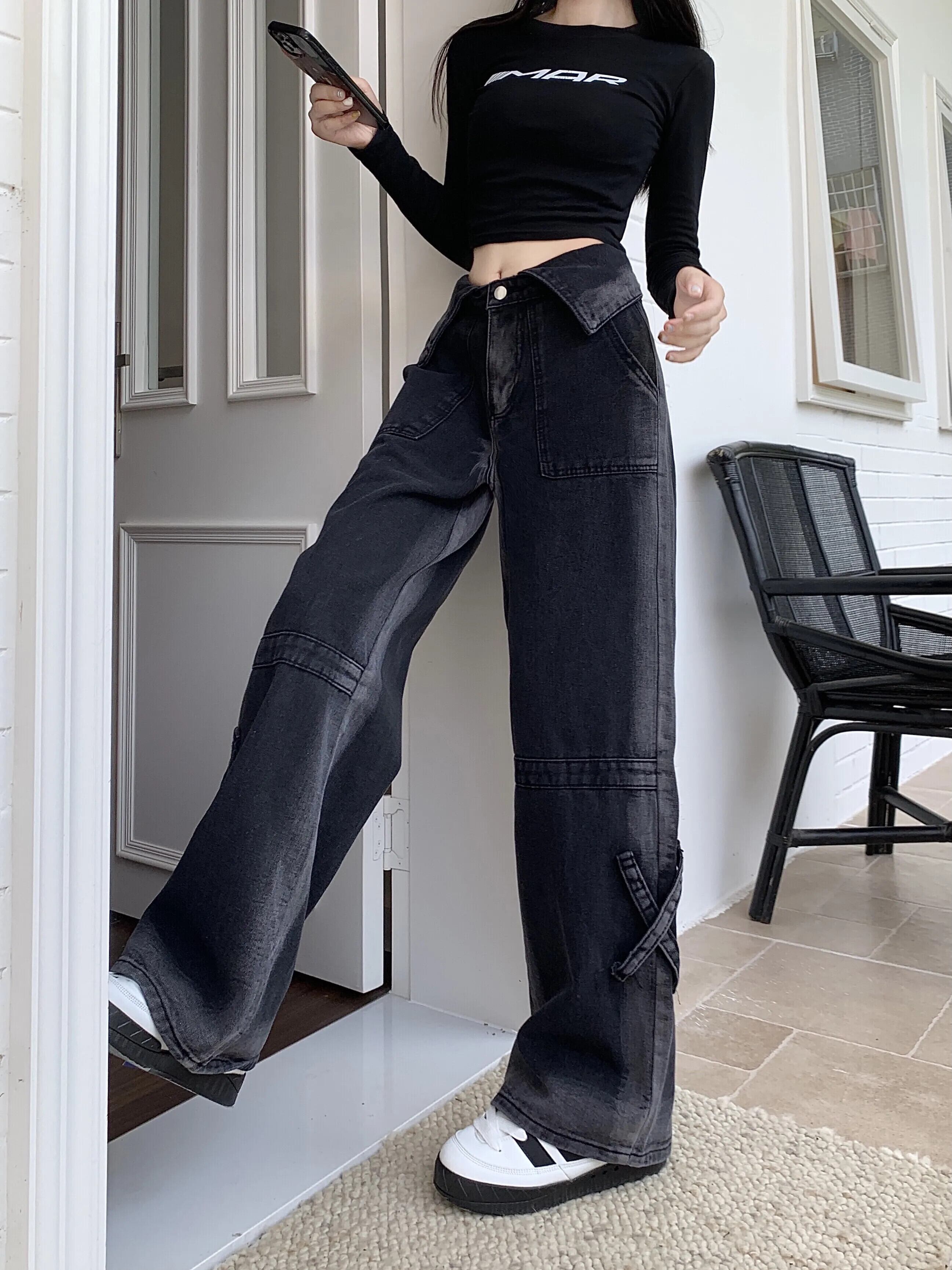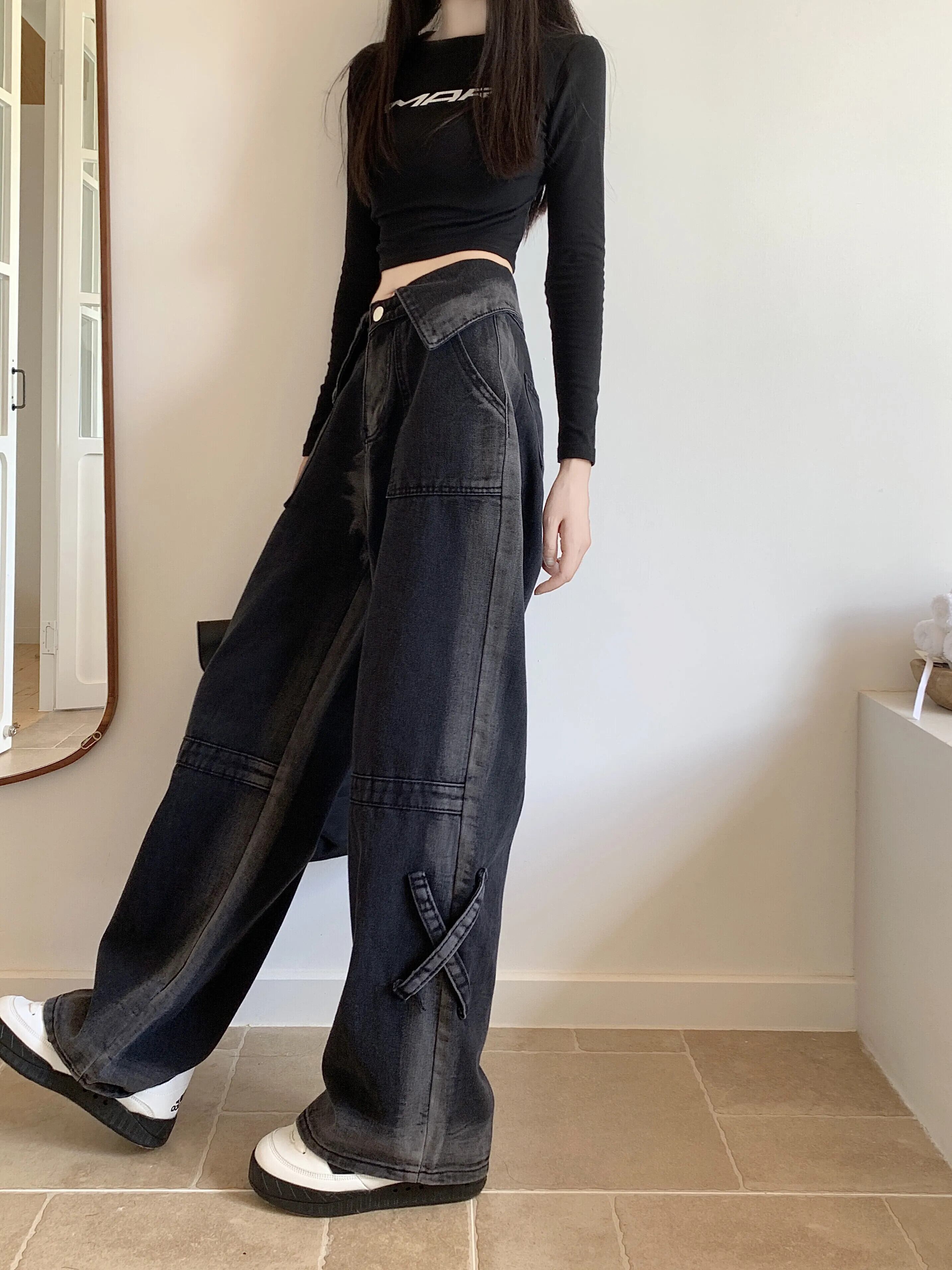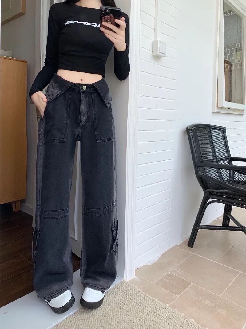 初秋グラデーションジーンズ レディース フラップウエスト ゆったりスリムジーンズ オータム 秋物