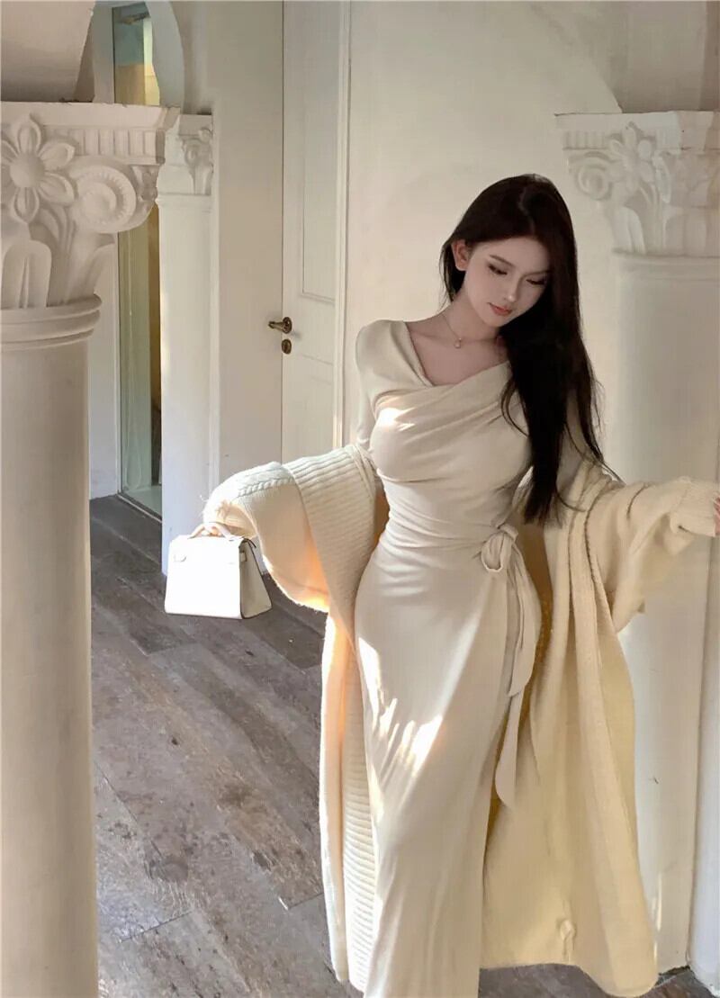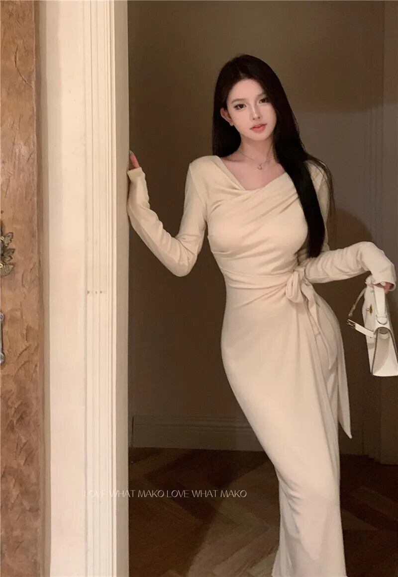 甘いホットガール V ネックレースアップスリムフィットドレス秋ニットラップヒップロングマーメイドドレス 大人ガーリー スウィート キュート カジュアル オータム 秋物 Vネック