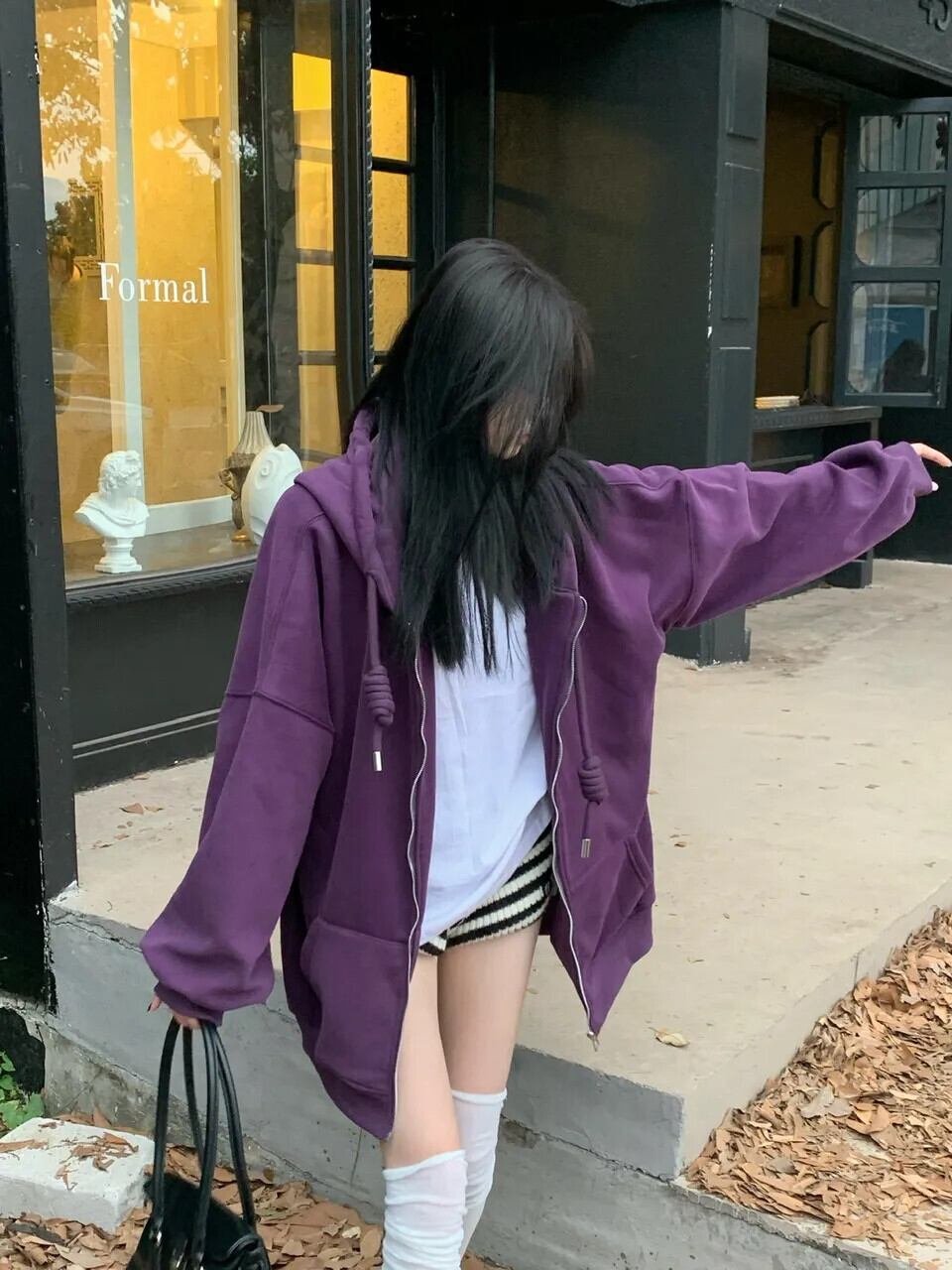 ホットガールオーバーサイズパープルスウェットシャツ秋と冬ぬいぐるみと厚みあるルーズフィットフード付きジャケット オータム 秋物 ウィンター 冬物