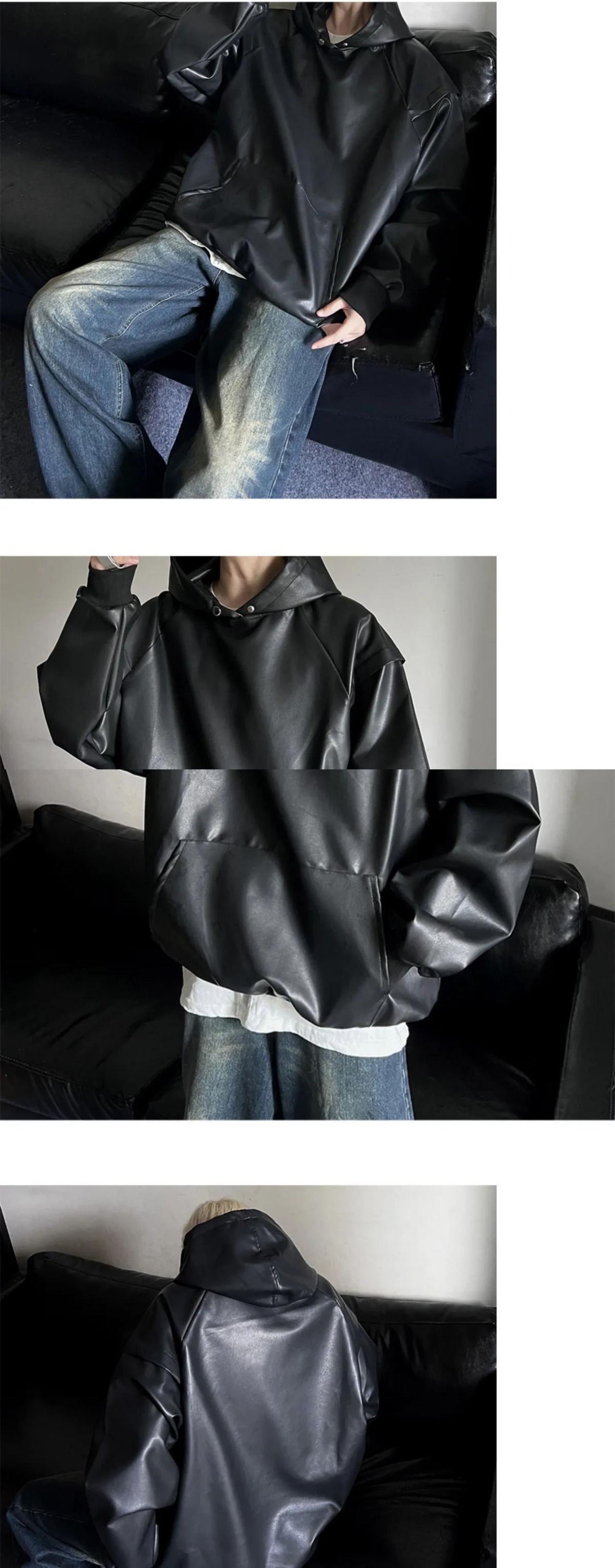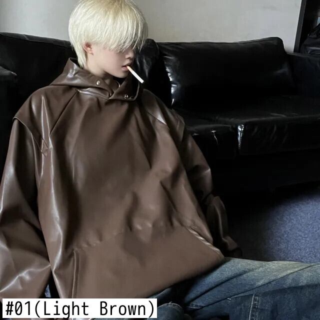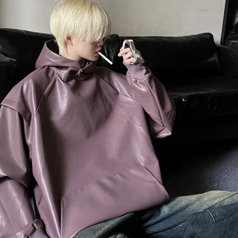 アメリカンクールスタイル Pu レザーパーカー秋明るい紫ルーズプルオーバートレーナートップ男性 オータム 秋物 パープル