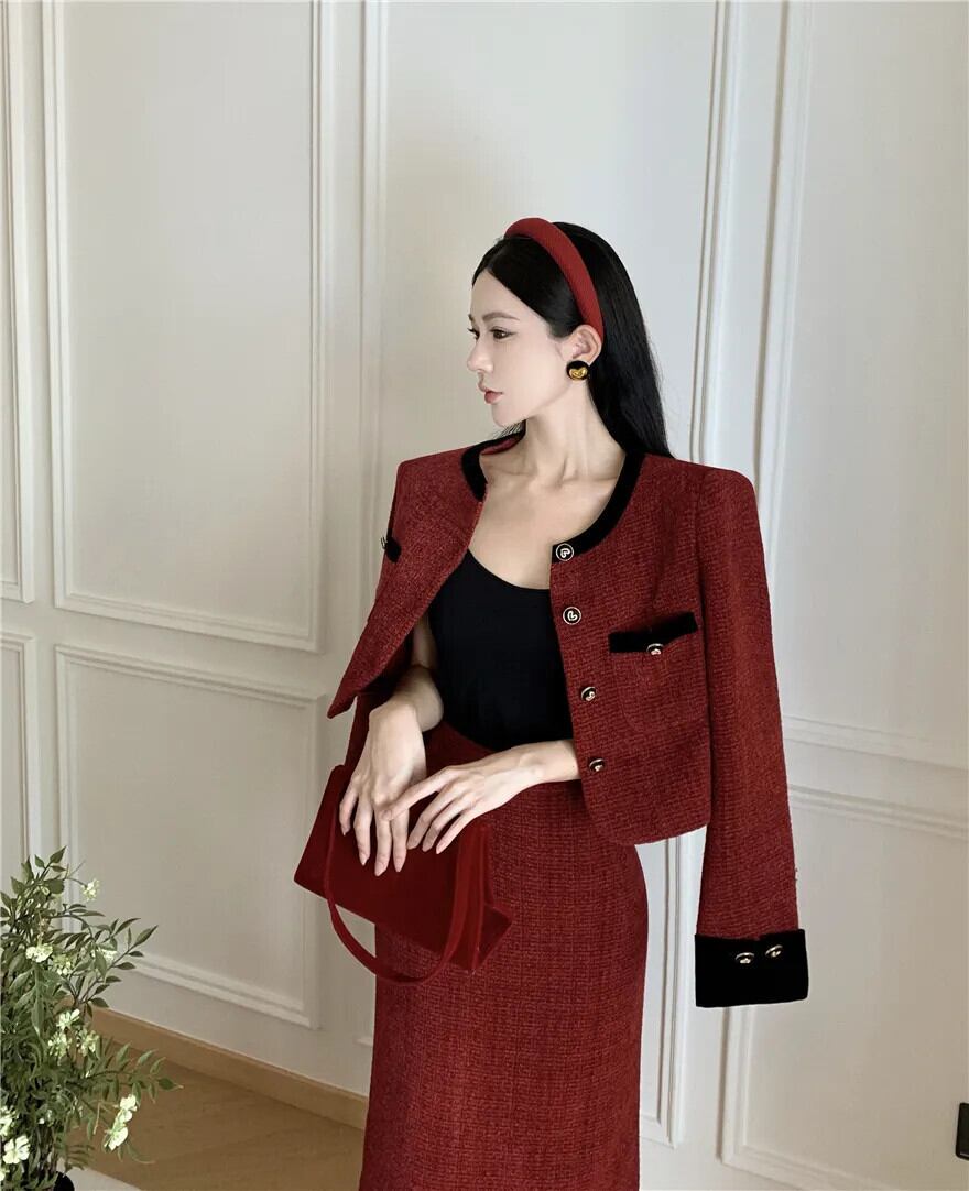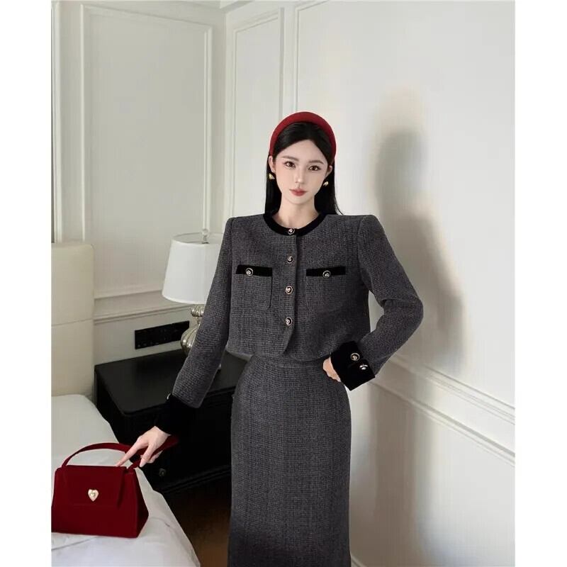 フレンチスイートホットガールスーツ秋/冬 O ネック長袖コートウエストロングスカート 2 点セット 大人ガーリー スウィート キュート カジュアル オータム 秋物 ウィンター 冬物 Oネック