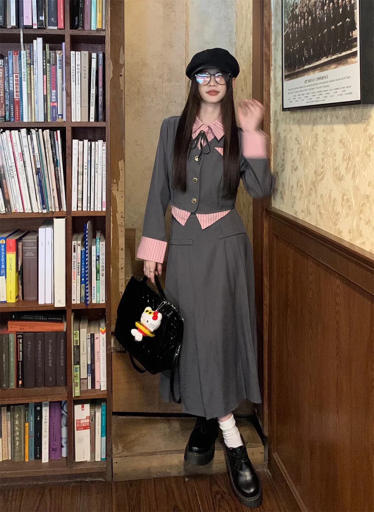 甘くてホットガールズスーツ レディース 秋コントラストショートコート ウエスト Aライン ロングスカート 2点セット 大人ガーリー スウィート キュート カジュアル オータム 秋物
