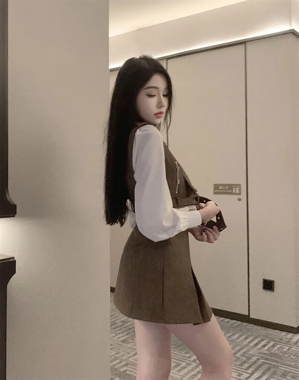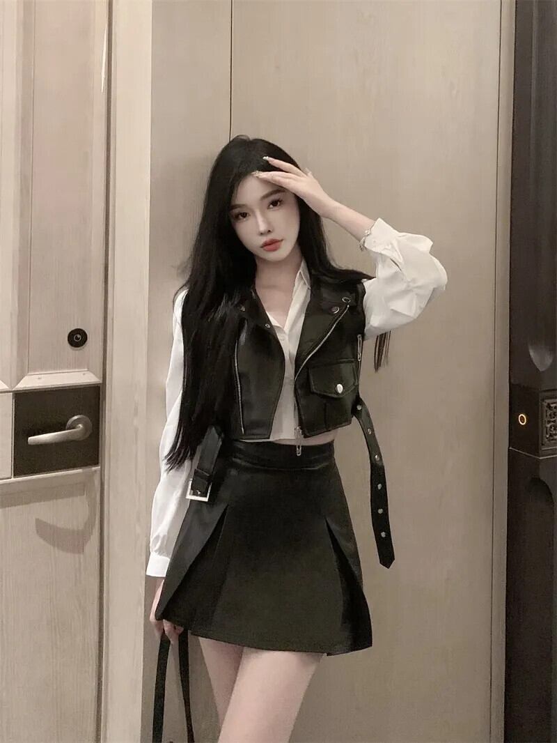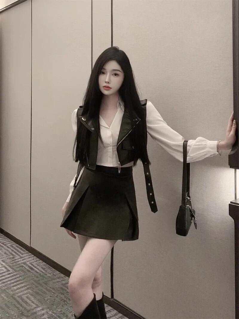 ホットガールスーツ秋長袖シャツベストウエストプリーツ A ラインミニスカート 3 点セット ロング オータム 秋物 Aライン