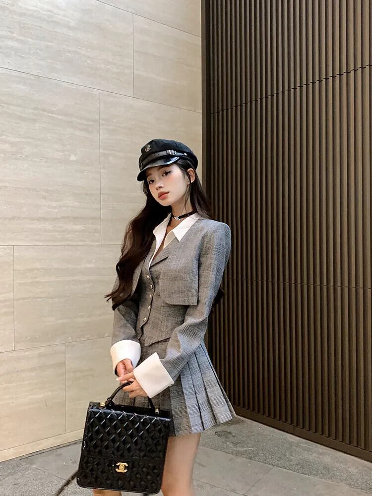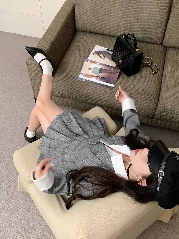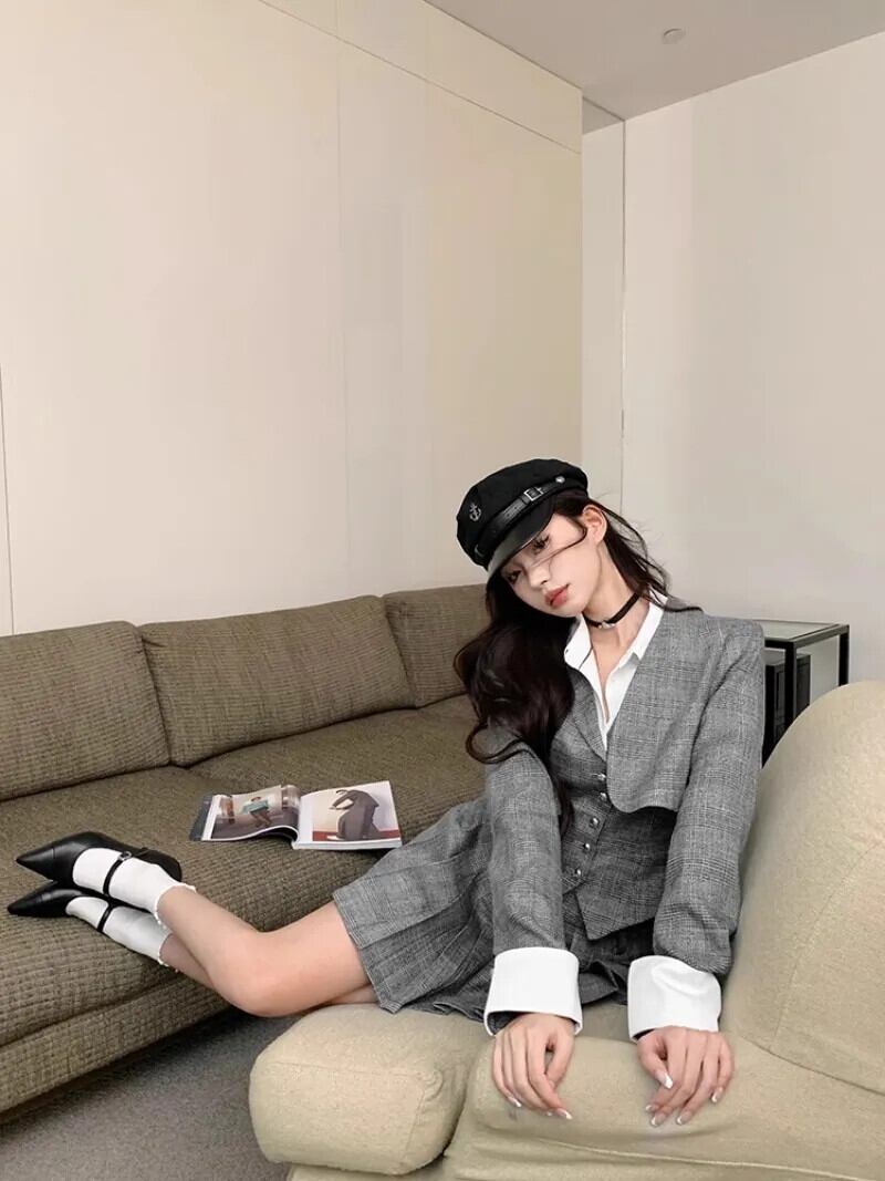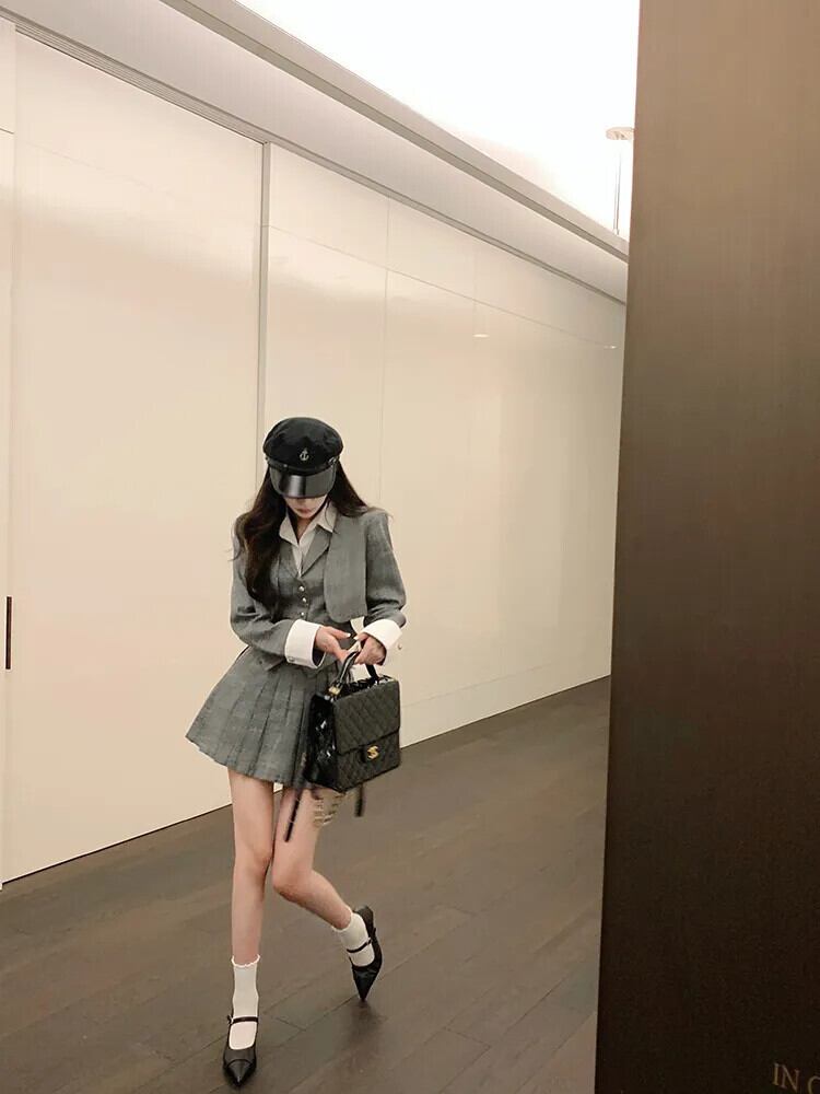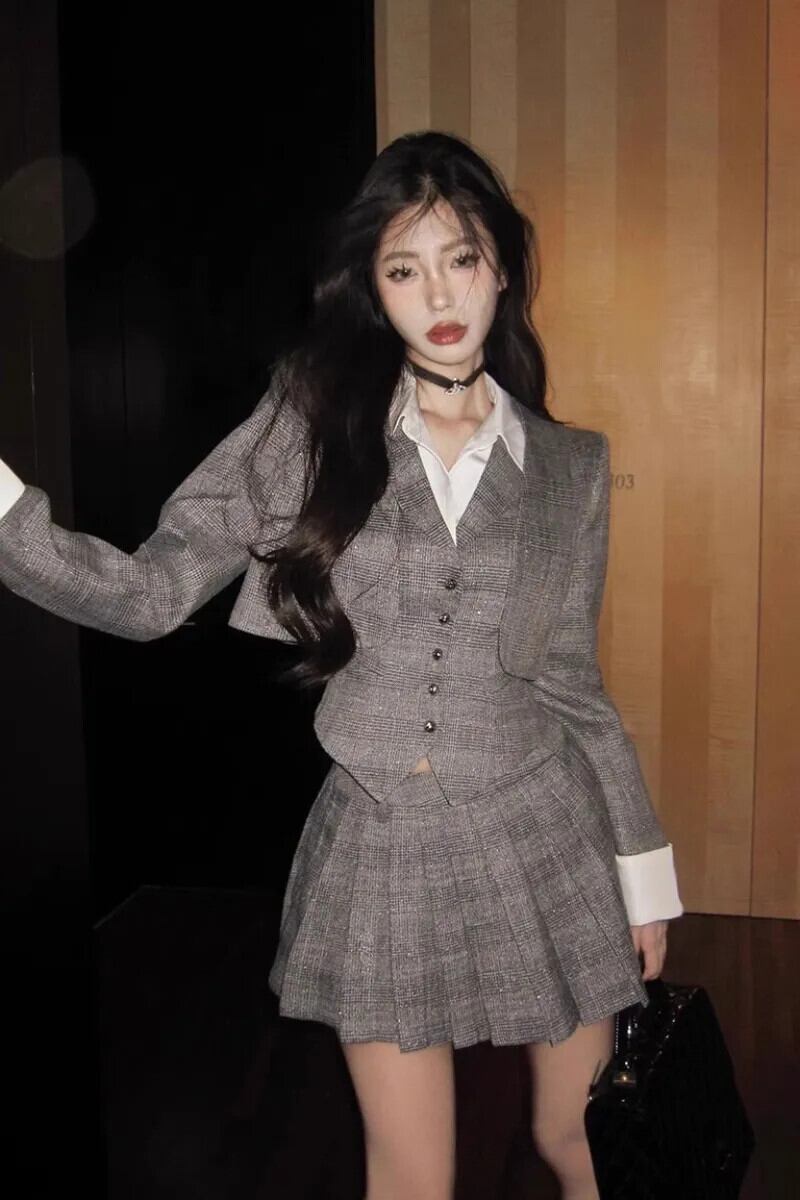 甘くてホットガールプレッピースタイルスーツ秋ショートコートベスト A ラインプリーツミニスカート 3 点セット 大人ガーリー スウィート キュート カジュアル オータム 秋物 Aライン