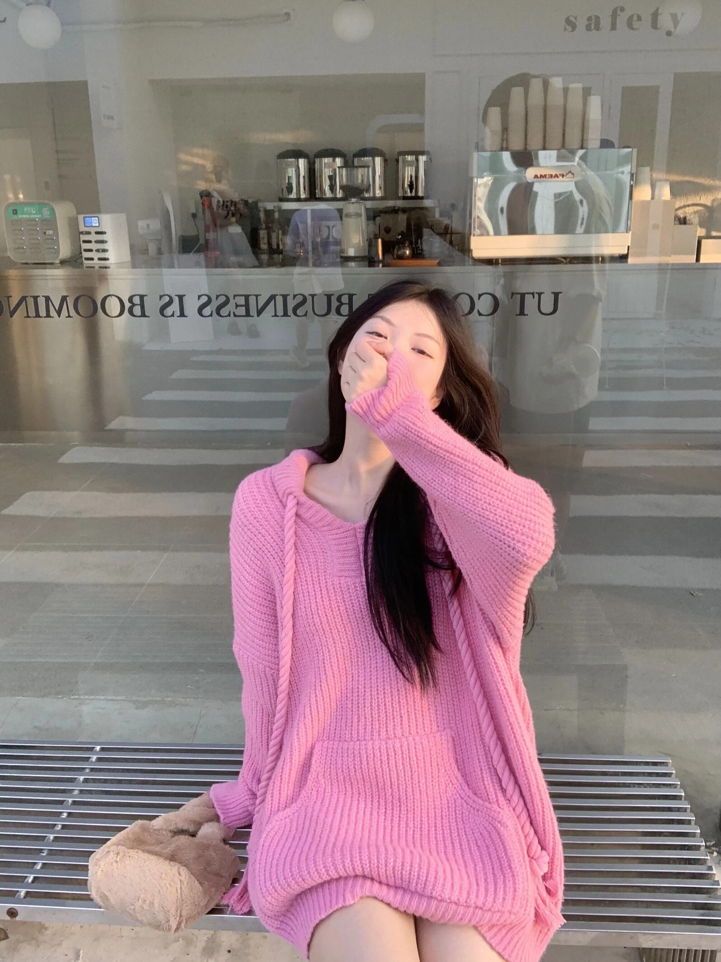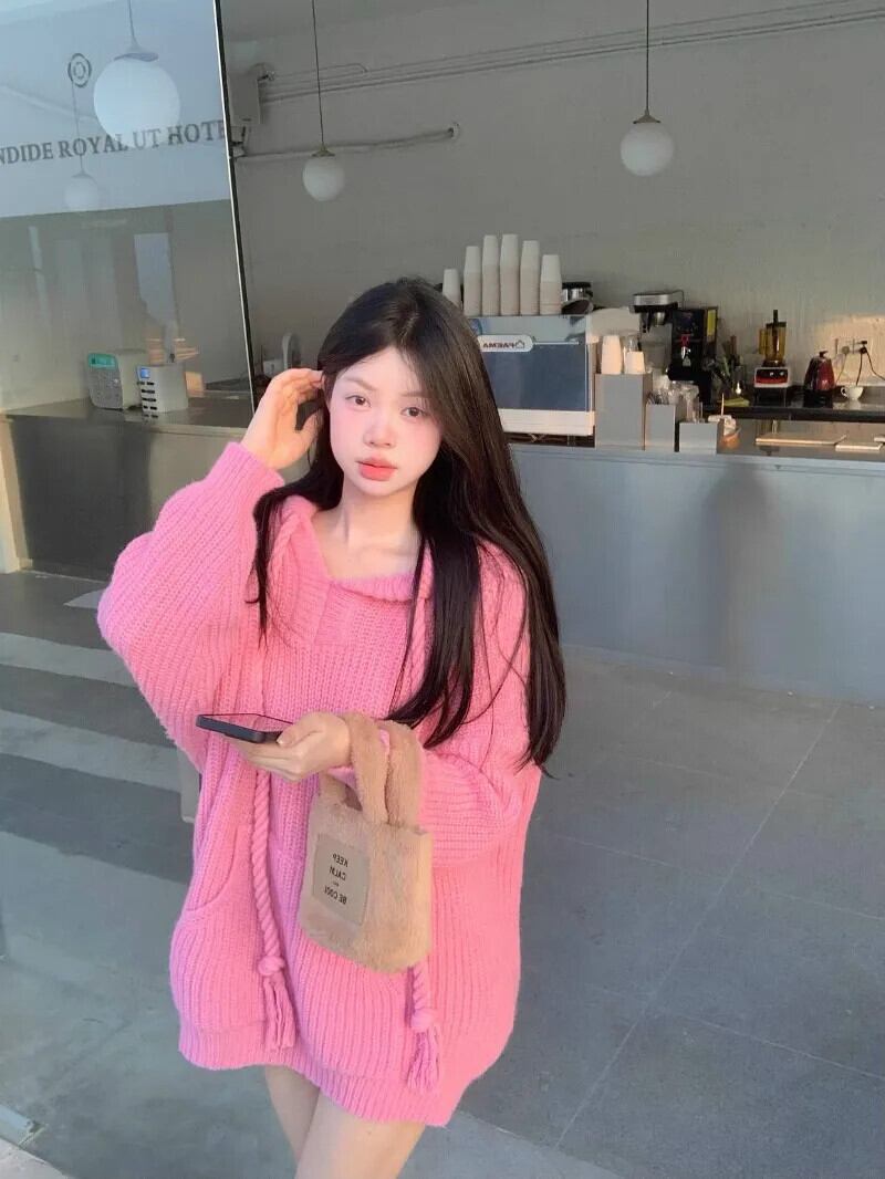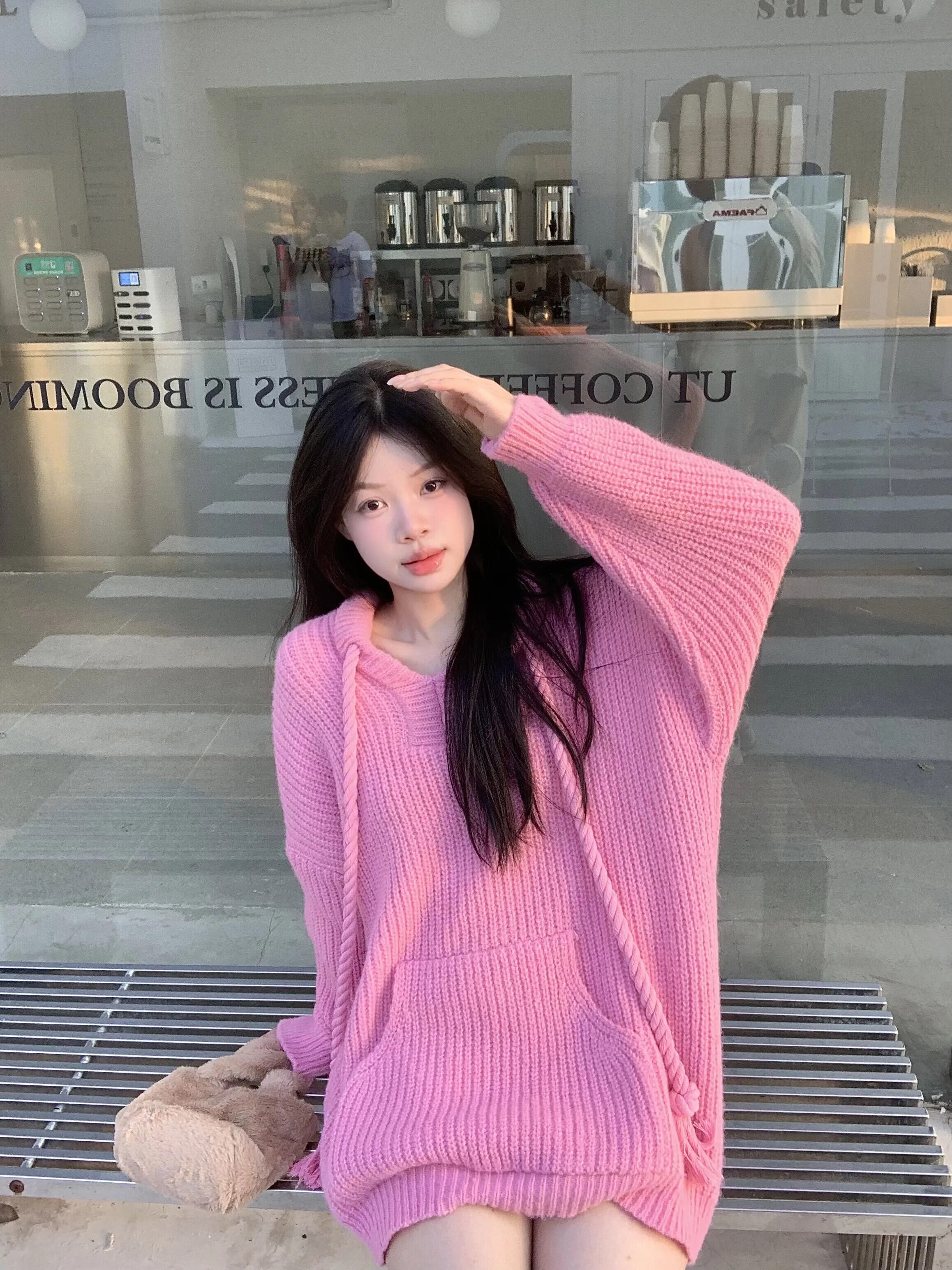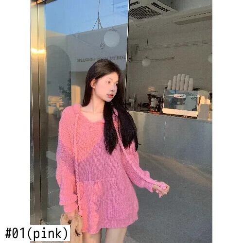 甘いホットガール巾着フード付き長袖トレーナー秋ルーズニットプルオーバートップ ロング 大人ガーリー スウィート キュート カジュアル オータム 秋物