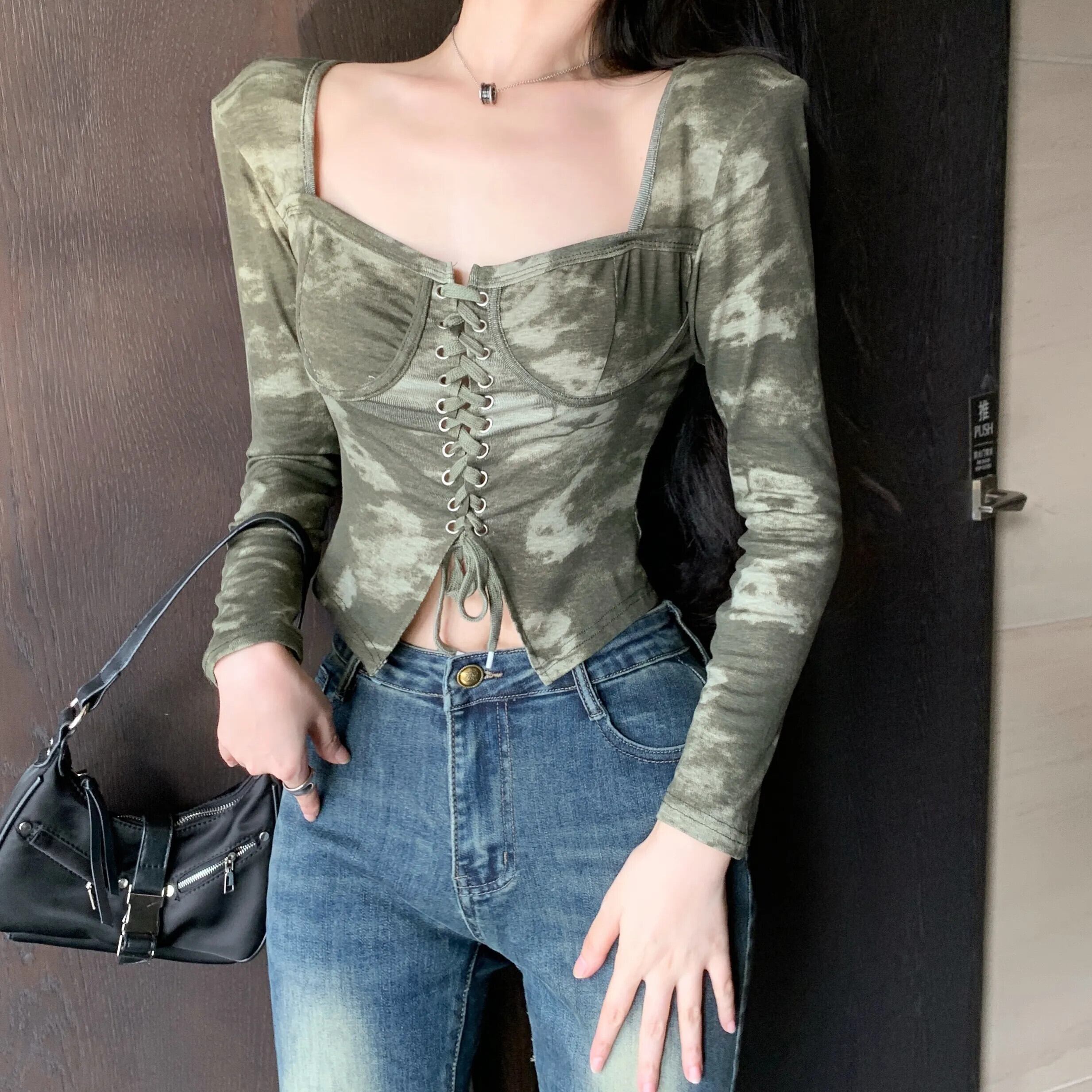 ホットガールスクエアカラーレースアップスリムフィット Tシャツ秋迷彩長袖ショートプルオーバートップ ロング オータム 秋物 スクウェア
