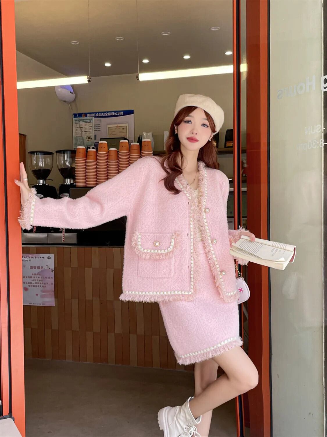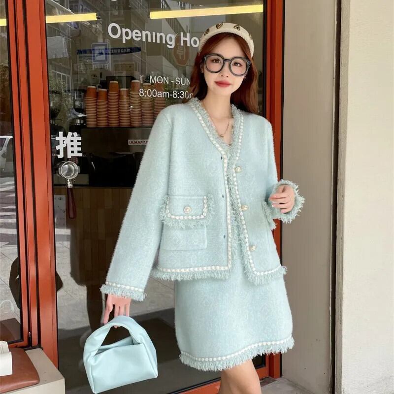 フレンチスタイル甘いホットガールスーツ秋模造ミンクフリースブルーコートミニスカートツーピースセット 大人ガーリー スウィート キュート カジュアル オータム 秋物