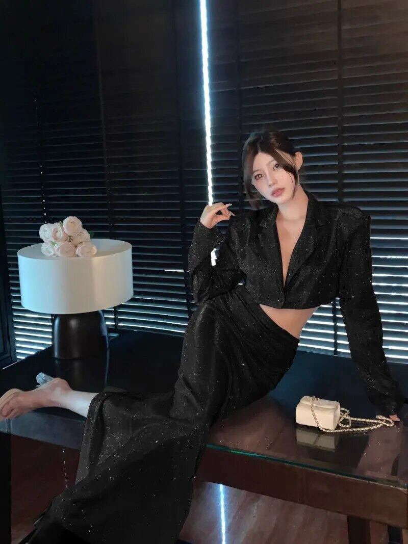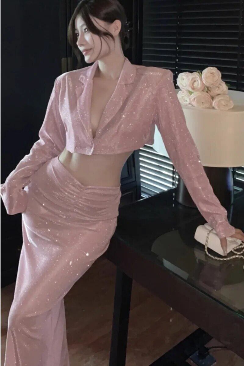 甘いホットガールスーツ秋長袖ショートトッププリーツラップヒップロングスカートツーピースセット 大人ガーリー スウィート キュート カジュアル オータム 秋物