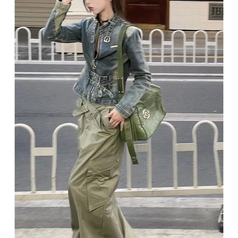 ホットガール洗浄レトロストレッチタイトデニムコート秋スリムフィットセクシーアメリカ長袖ジャケット ロング オータム 秋物