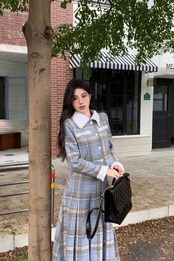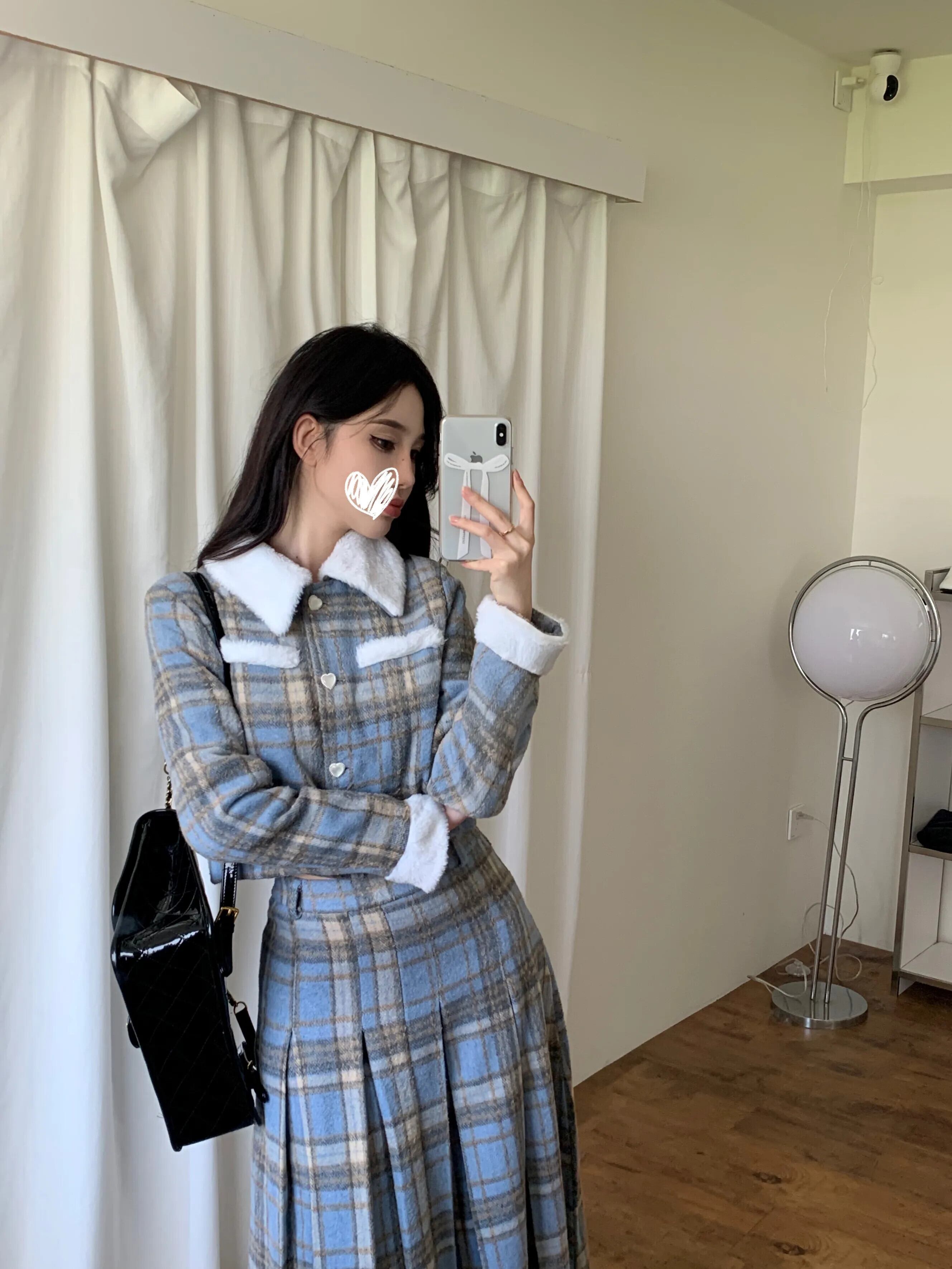ホットガールレトロスタイルスーツ秋チェック柄ウールショートジャケットミディアム丈 A ラインプリーツスカート 2 点セット オータム 秋物 Aライン