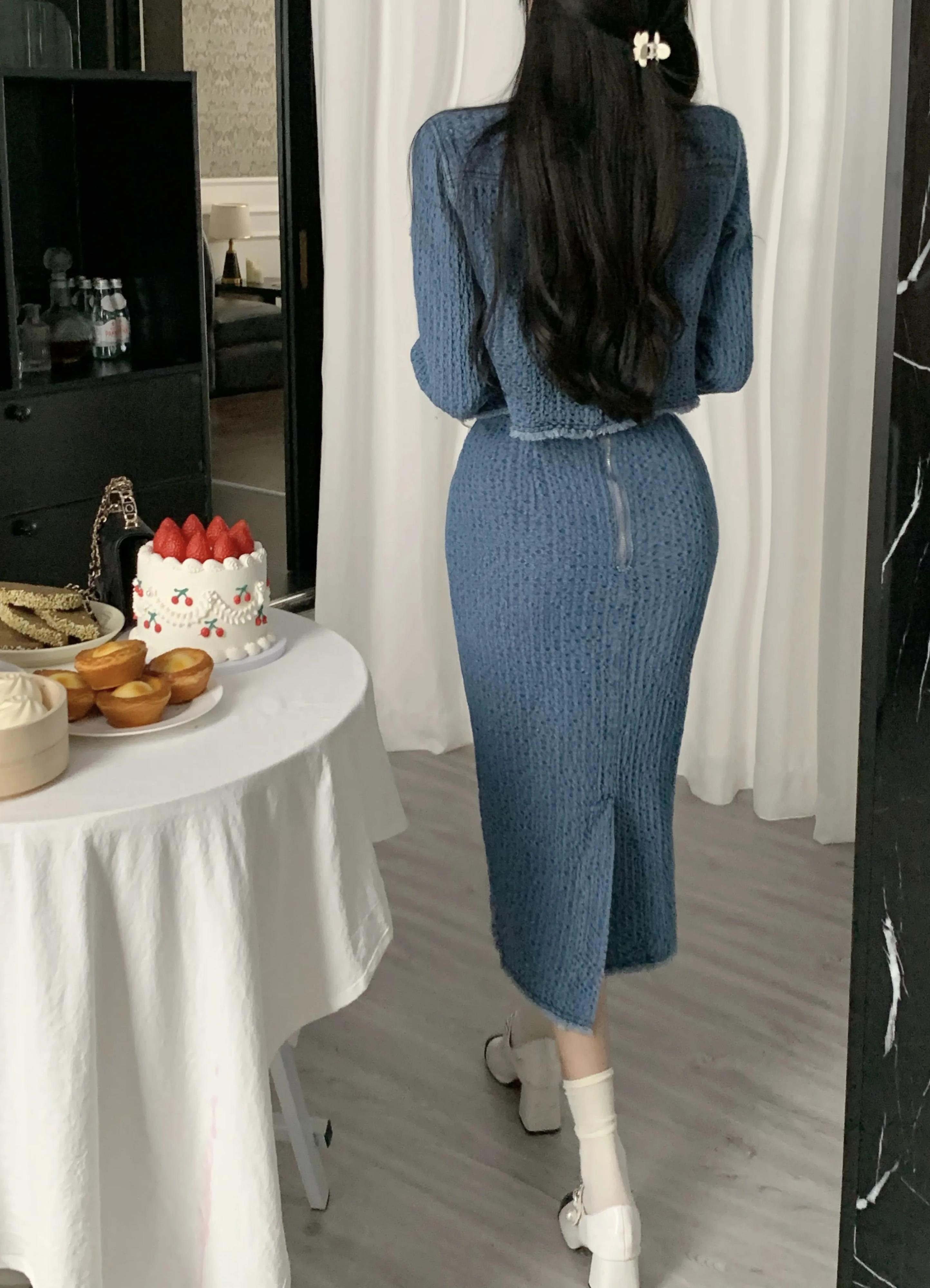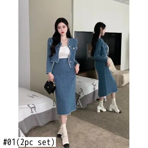 フランスオフィスレディデニムスーツ秋テルコートウエストロングスカートツーピースセット オータム 秋物 会社 学校 通勤や通学にも
