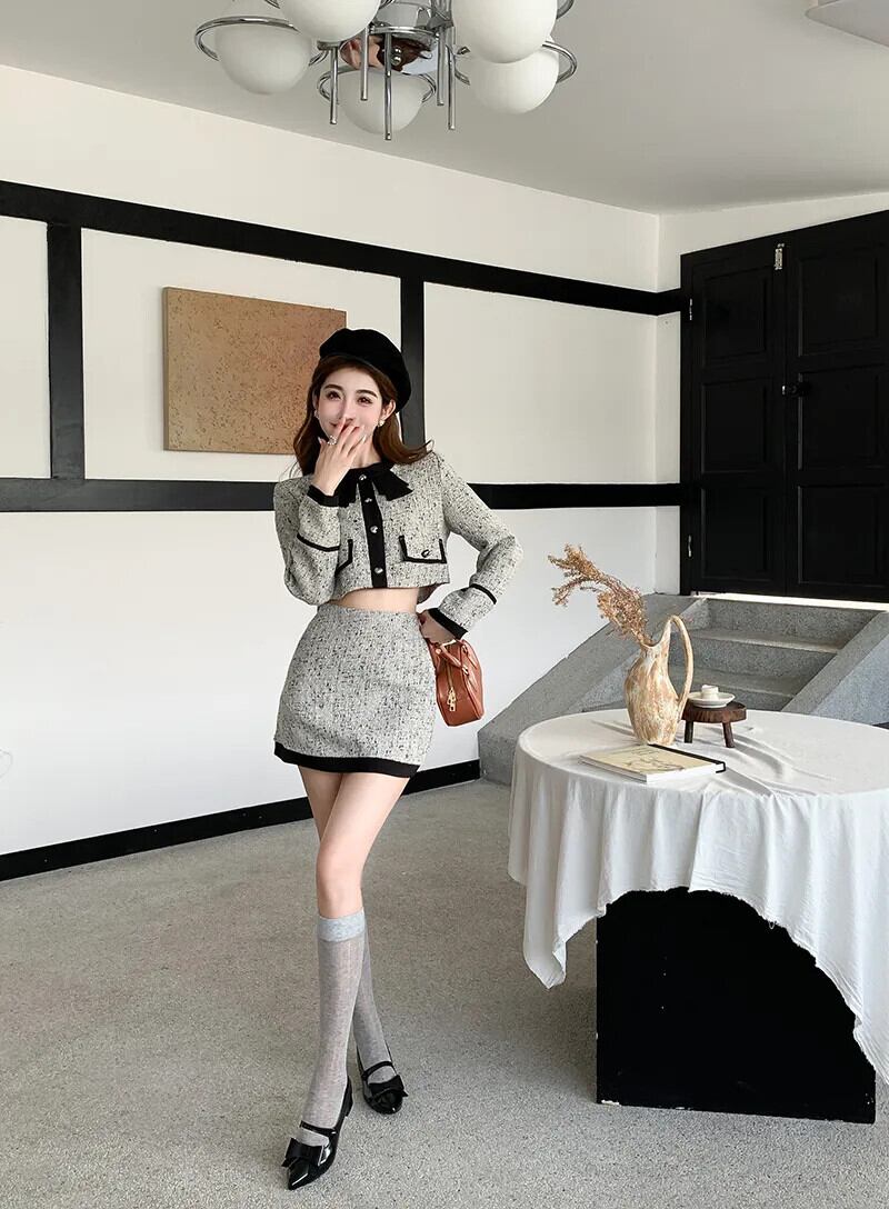 甘いホットガールスーツ秋長袖 O ネックボウジャケットウエストショートスカート 2 点セット ロング リボン 大人ガーリー スウィート キュート カジュアル オータム 秋物 Oネック