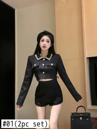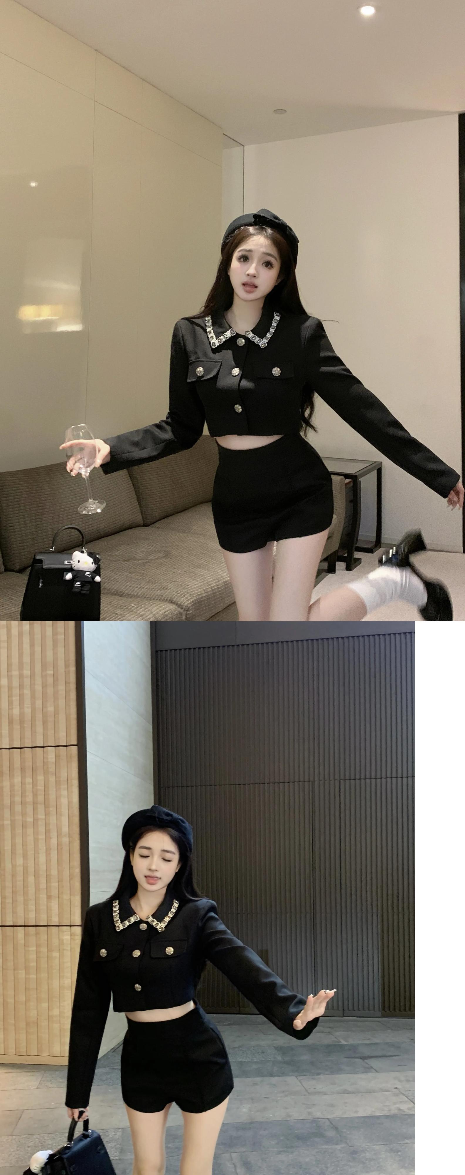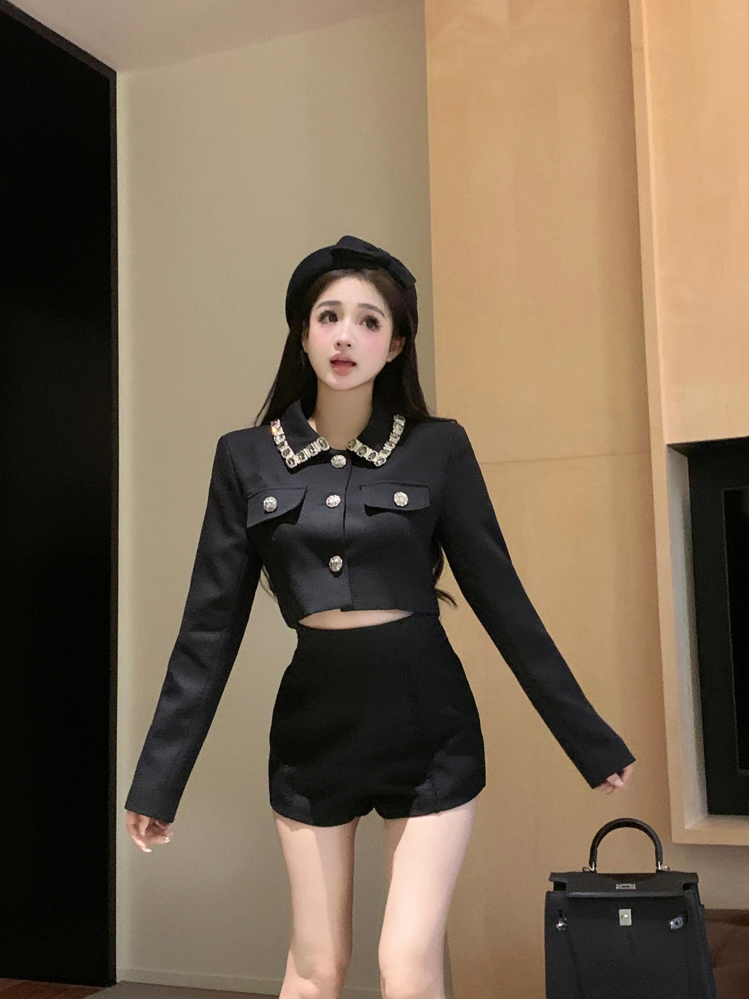 甘いホットガールスーツ秋ラインストーンパッチワークショートジャケットウエストショーツ黒ツーピースセット ブラック 大人ガーリー スウィート キュート カジュアル オータム 秋物 ブルマー
