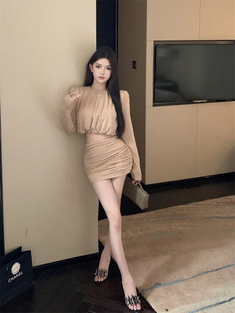 Sweet Girl セクシースーツ秋 O ネック長袖トッププリーツラップヒップショートスカート 2 点セット ロング 大人ガーリー スウィート キュート カジュアル オータム 秋物 Oネック