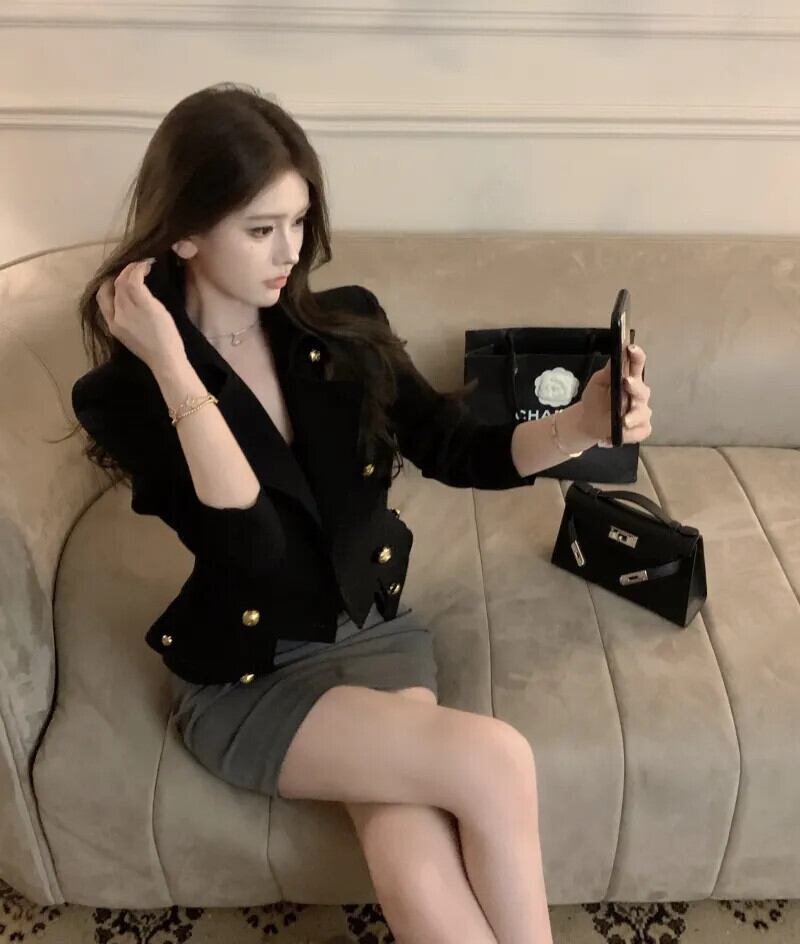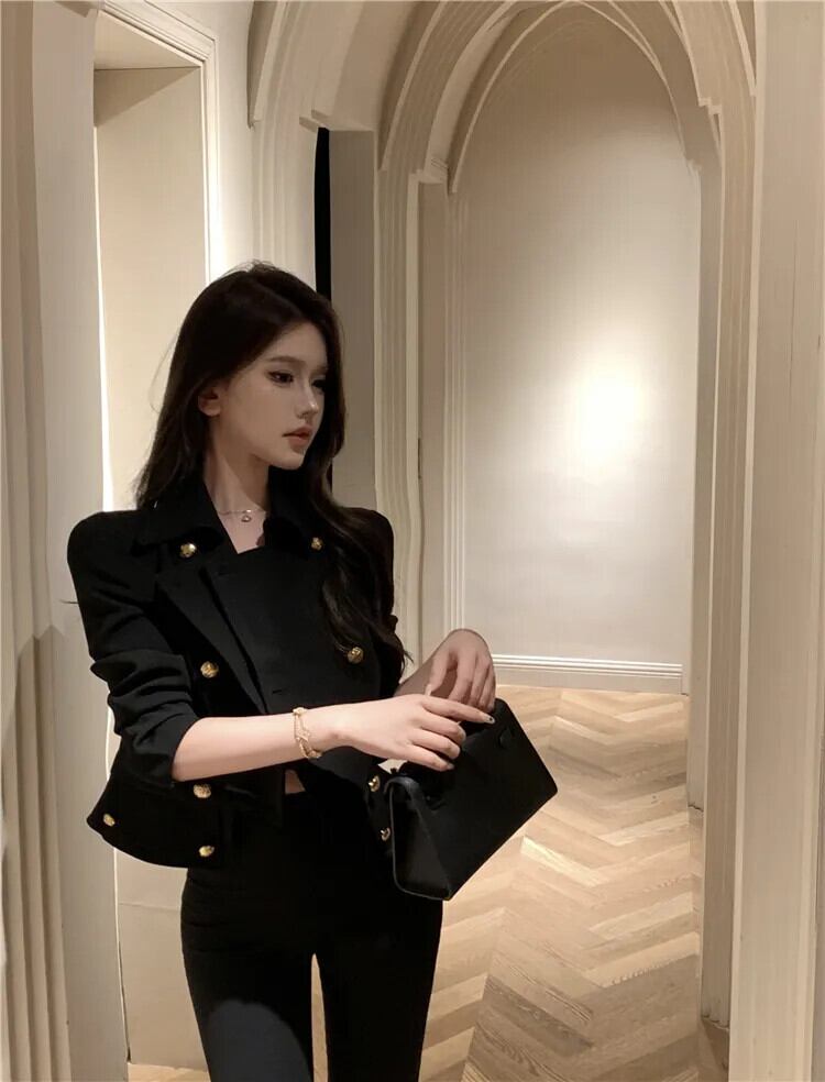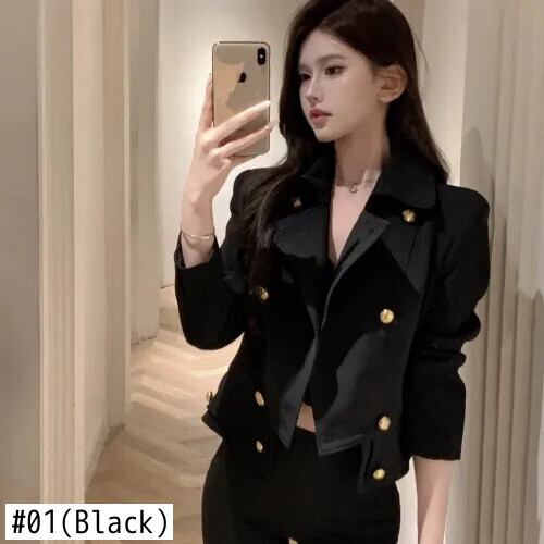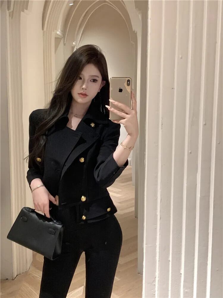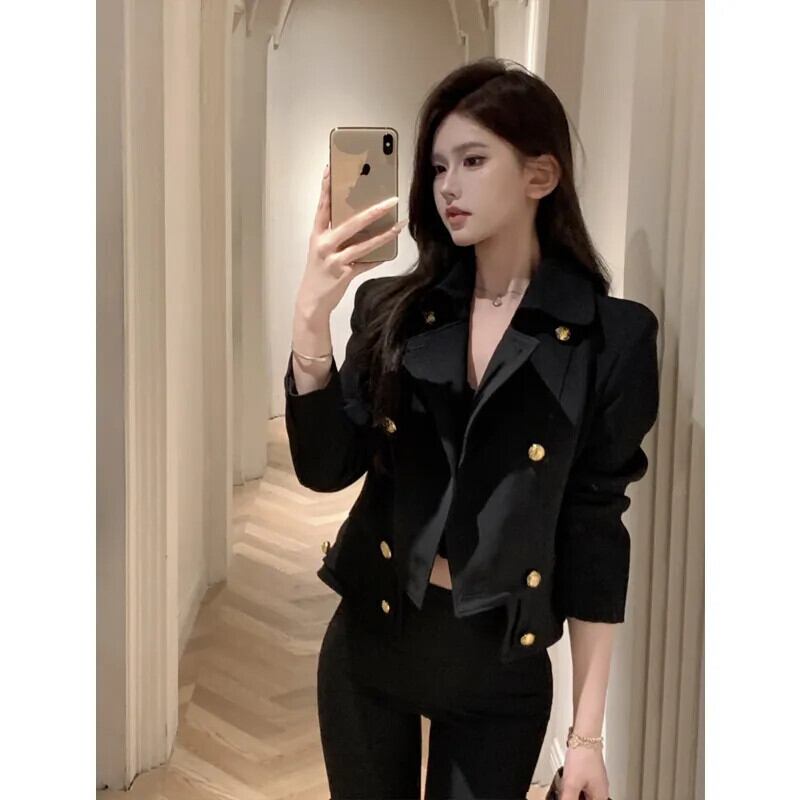 ホットガールブラックゴールドコート秋ターンダウン襟ダブルブレスト長袖カーディガンジャケットトップ ロング オータム 秋物