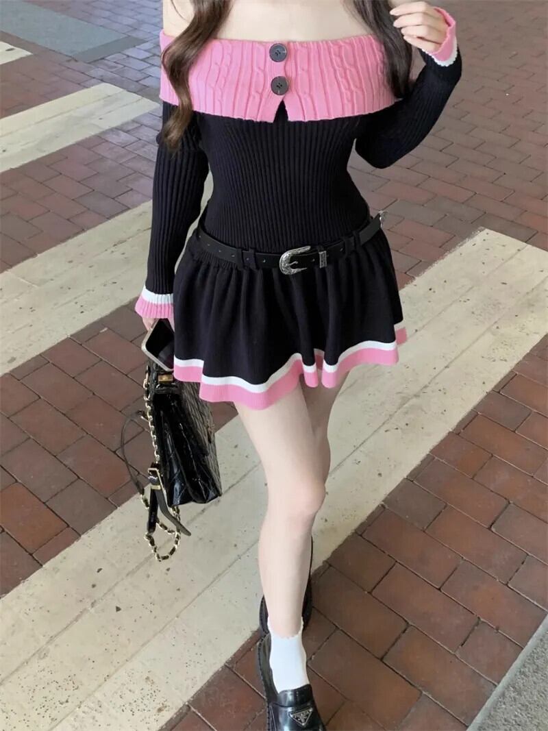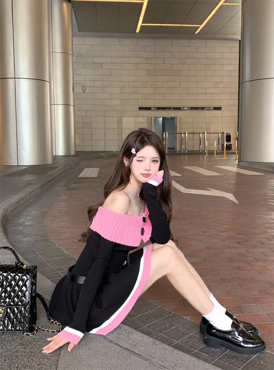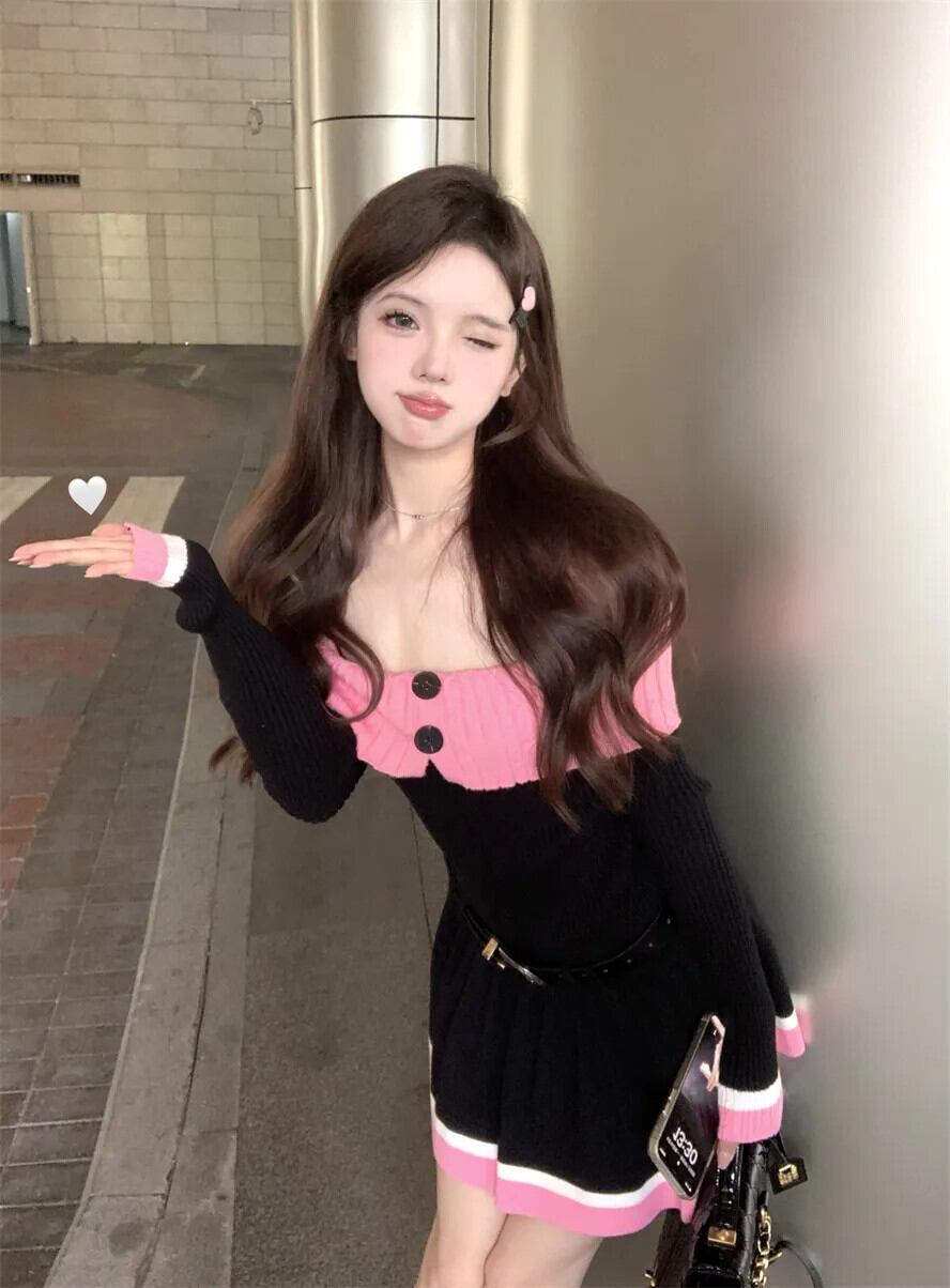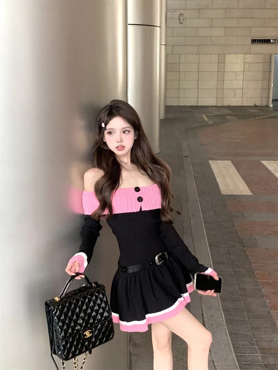 甘くてホット女子コントラストカラースプライシングニットドレス秋純粋セクシーオフショルダースリムフィットドレス 大人ガーリー スウィート キュート カジュアル オータム 秋物 ピュア