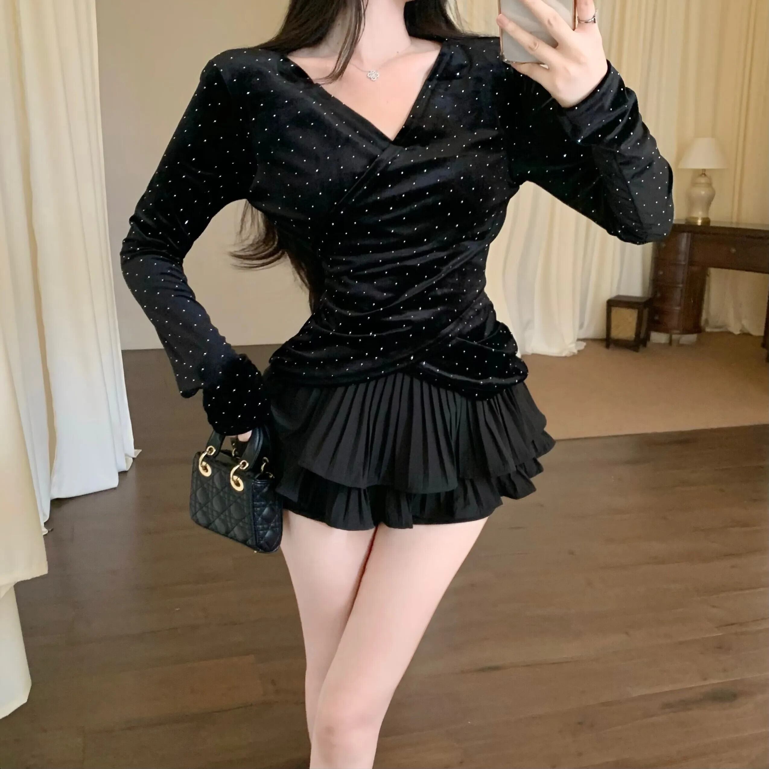 ホットガールスーツ秋 V ネック長袖ベルベットトップウエストスカートパンツ 2 点セット ロング オータム 秋物 Vネック