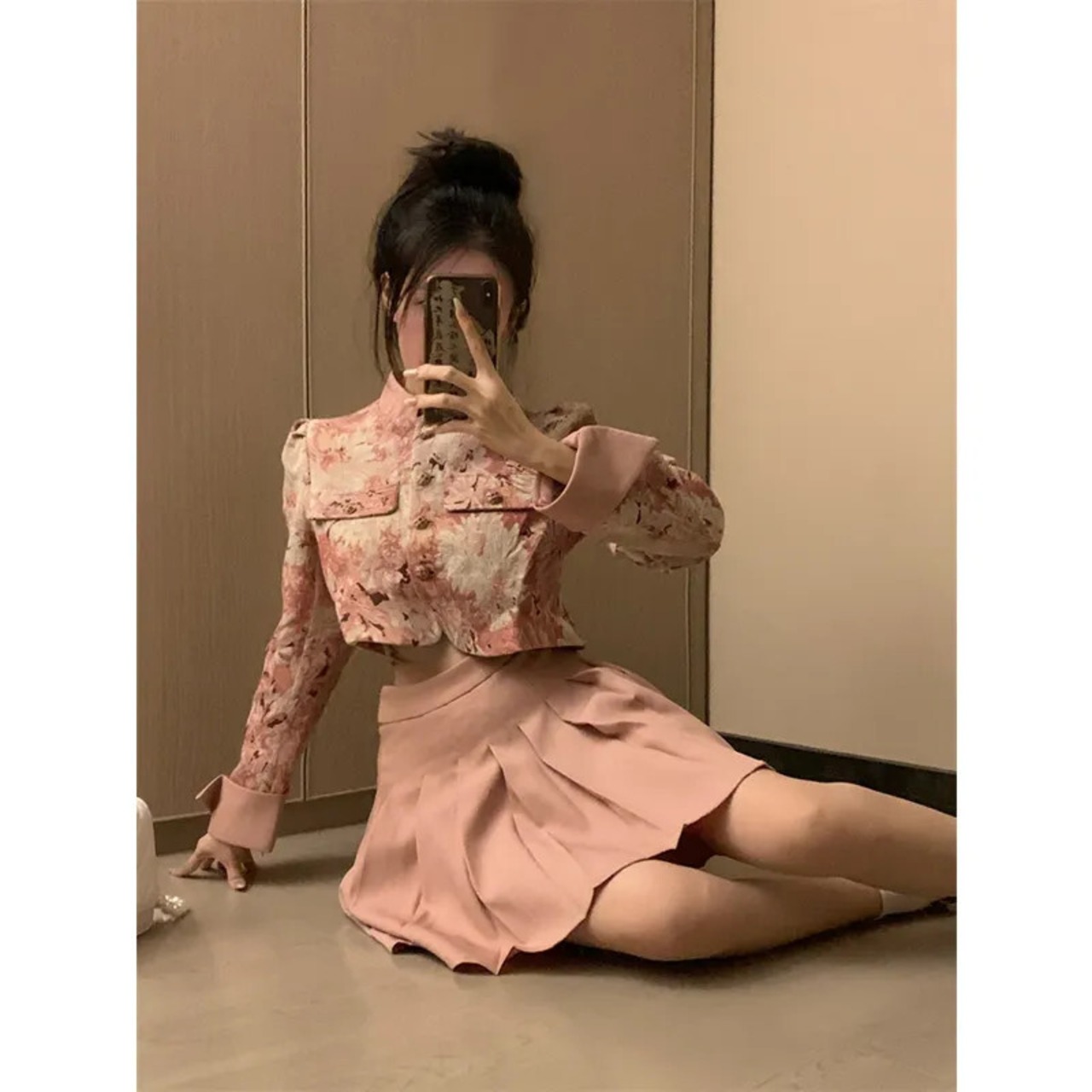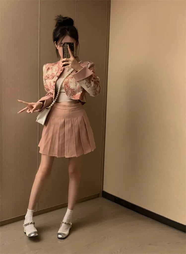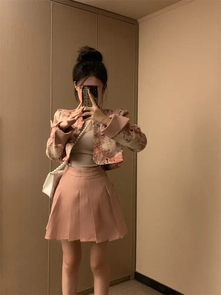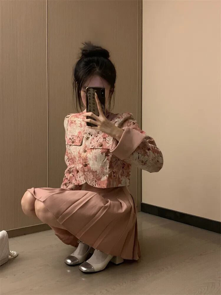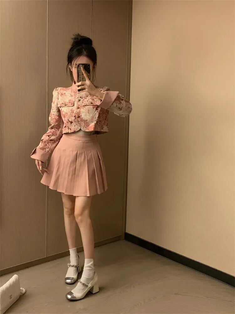 甘いホットガールスーツ秋花スタンドカラージャカードジャケット A ラインプリーツスカートピンク 2 点セット 大人ガーリー スウィート キュート カジュアル オータム 秋物 花柄 Aライン