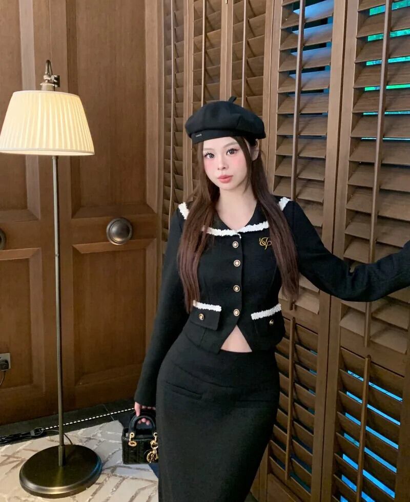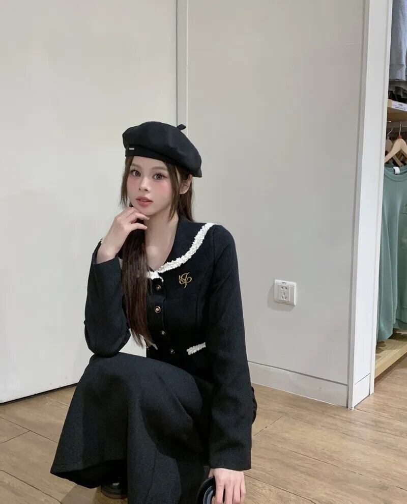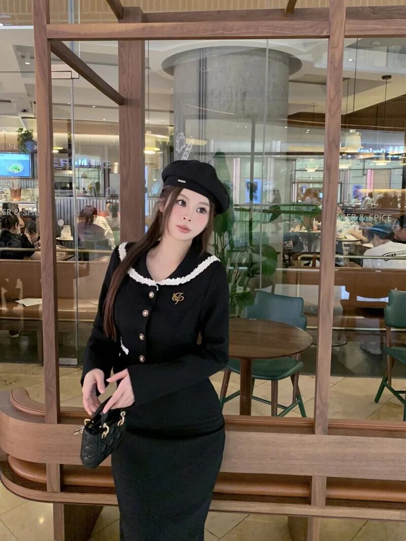 フレンチスイートホットガールスーツ秋セーラー襟コントラストショートコートウエストミニスカートツーピースセット 大人ガーリー スウィート キュート カジュアル オータム 秋物
