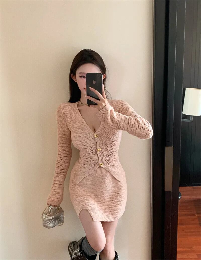 ホットガール純粋セクシーニットスーツ秋アウト長袖カーディガントップ分割ラップヒップミニスカートピンク 2 点セット ロング オータム 秋物 ピュア