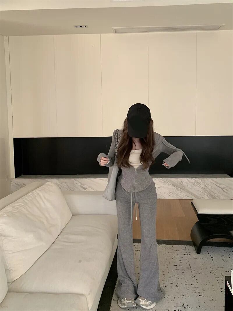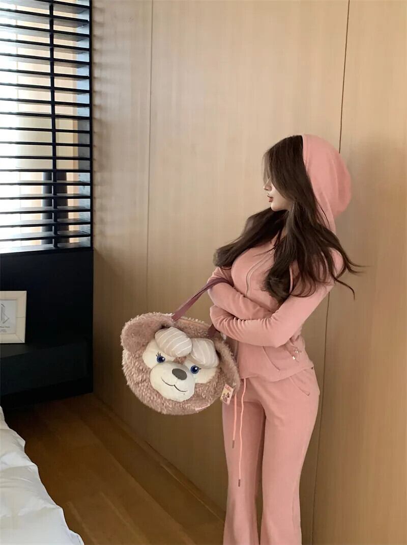 フレンチスポーツスーツ秋フード付きトレーナーウエストわずかフレアモップパンツツーピースセット レッド オータム 秋物